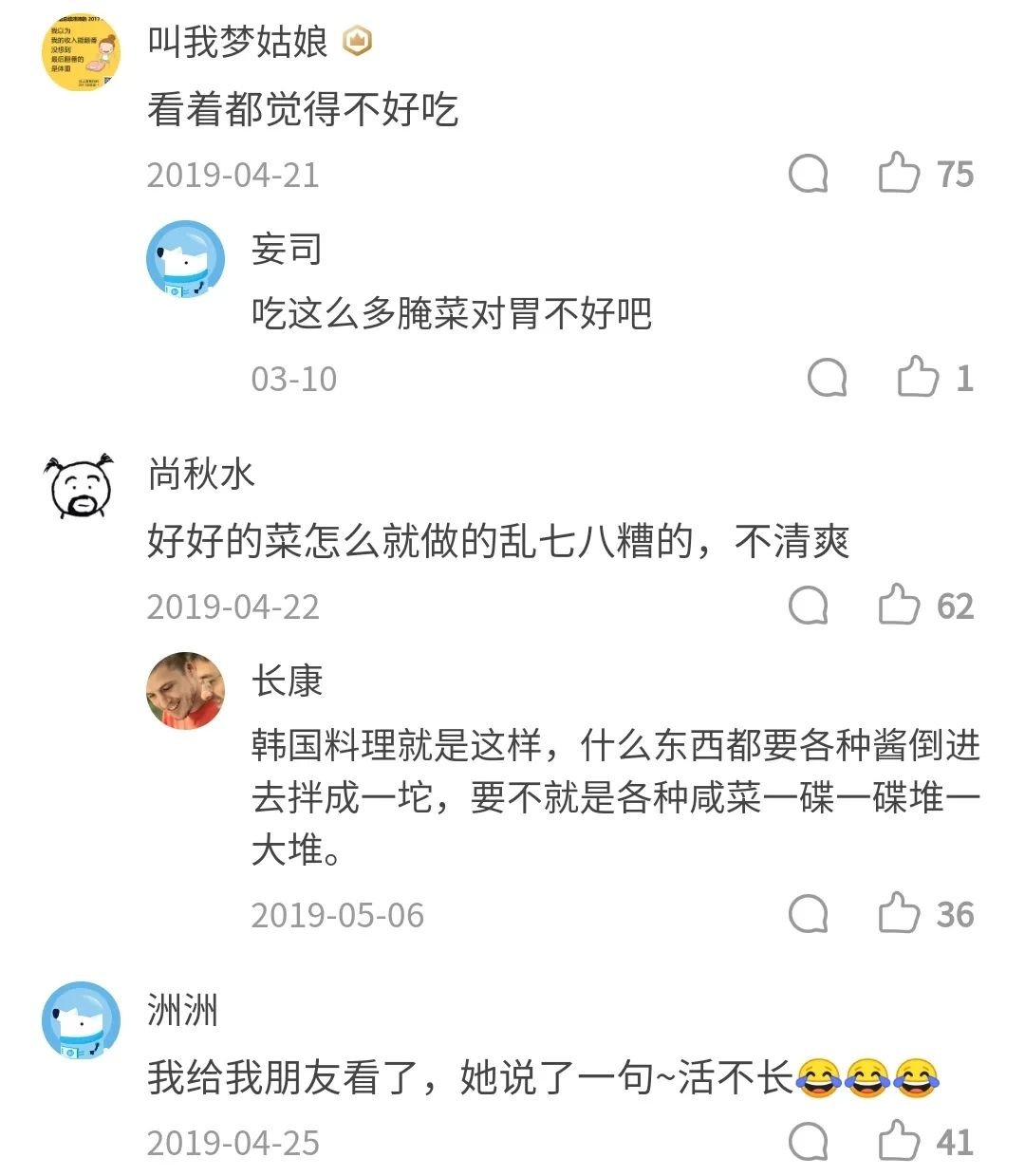 在知乎“如何评价韩国料理”的提问下,吐槽声占了多数。有用户表示,韩国食品大多是烤肉和炸鸡,而味道基本上离不开酱料,“酱伴万物”反复出现,不仅视觉疲劳,味蕾也会麻木;还有用户表示,韩料的热量非常高,且重油重盐,几乎就是不健康的代名词,只能浅尝辄止。