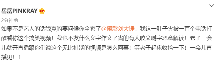 截至目前,岳明辉对于该事件做出回应,称自己被人恶意解读,十分恼火,一会儿要开直播为大家解释这件事。