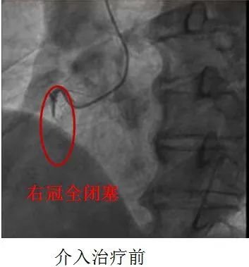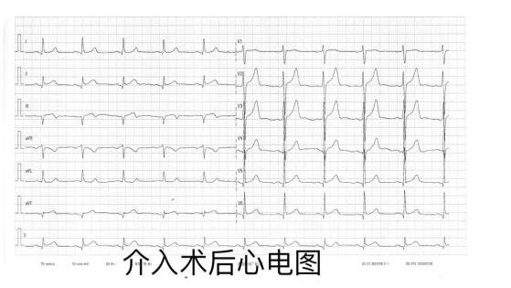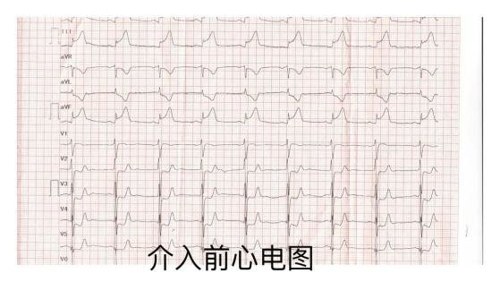 该患者男性71岁,因“胸痛、胸闷2小时”就诊社区医院,社区医院行心电图检查提示:急性下壁心肌梗死,社区医院建议转院治疗,于10点05分家属拨打急救电话进行转院。10分钟后急救车到达社区医院,120医生将心电图传至医院胸痛中心微信群,通过心内科值班医生进行会诊后确定急性心肌梗死应该进行冠脉介入治疗,120医生随即与患者及家属沟通,告知病情及治疗方案,家属同意绕行急诊直接进入导管室介入治疗。