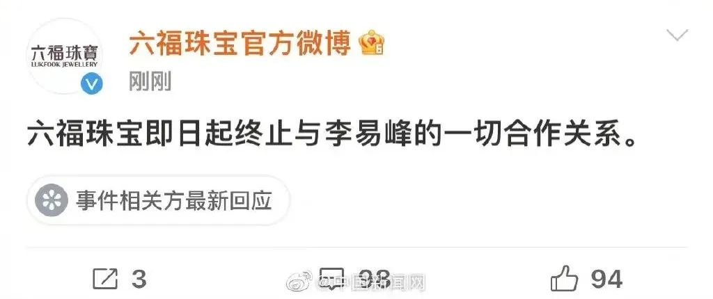 官方通报后,各大品牌方、出品方连忙解约,真果粒、京都念慈庵、六福珠宝、舒适达……不下10个品牌发声明和李易峰终止合作关系。