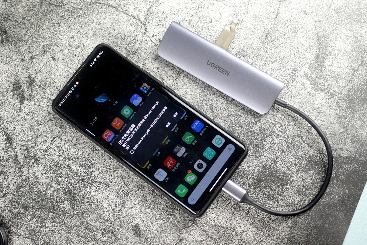 遇到突发情况,我们还可以接到手机上,实现数据的快速读取,省去等待电脑开机的时间,而且也便于手机数据的备份。扩展坞接到手机上也是快速识别。