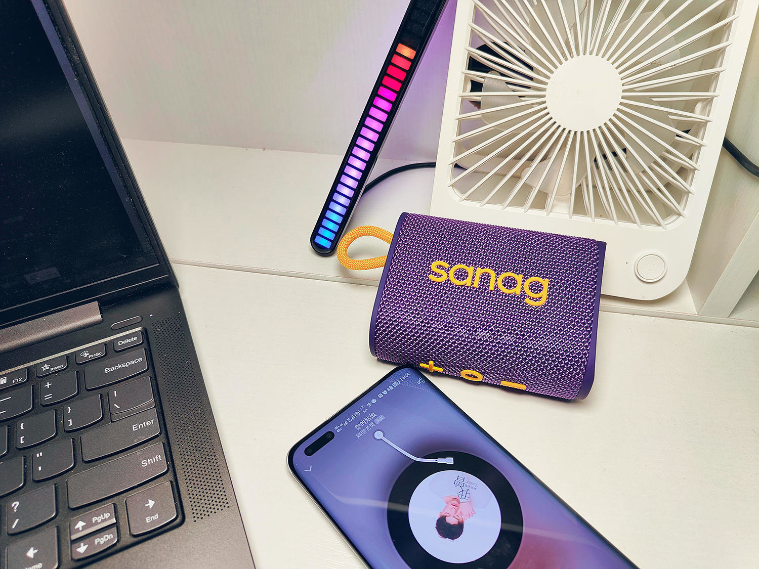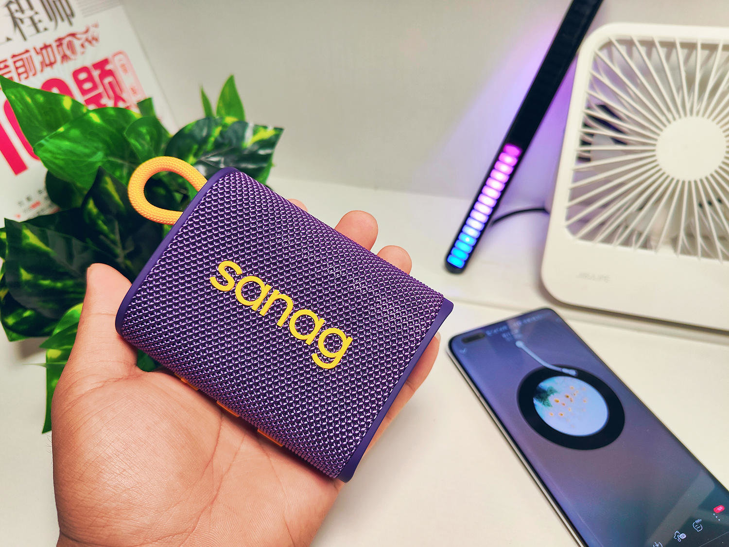 Sanag M13S PRO蓝牙音箱还不仅仅有织物纹理设计的一面,它还有一面是有氛围灯的,在进行音乐播放时,这个氛围灯会根据音乐的频谱变化,出现闪闪发光的灯环,让傍晚的户外,能够跟着灯光嗨起来。