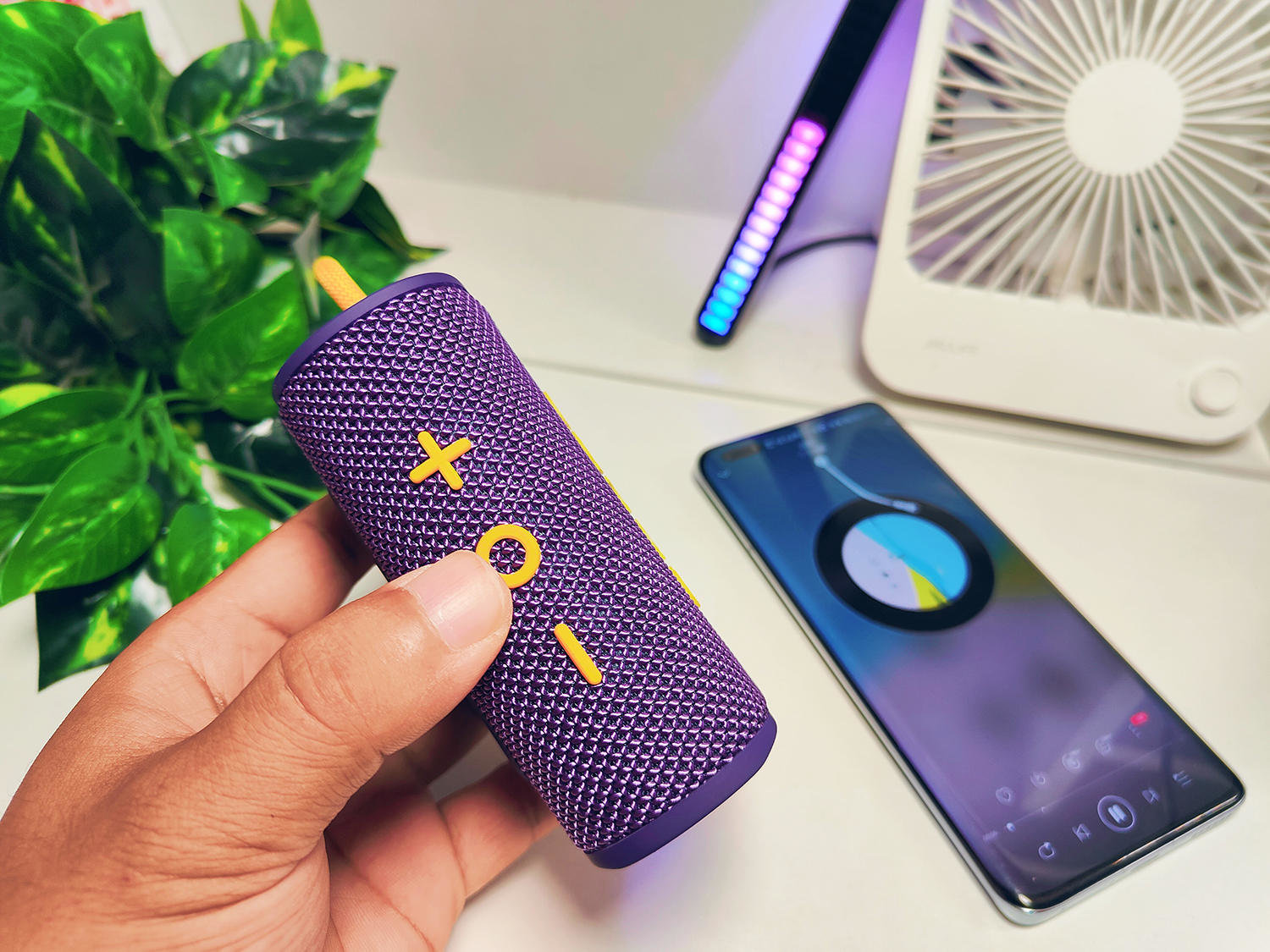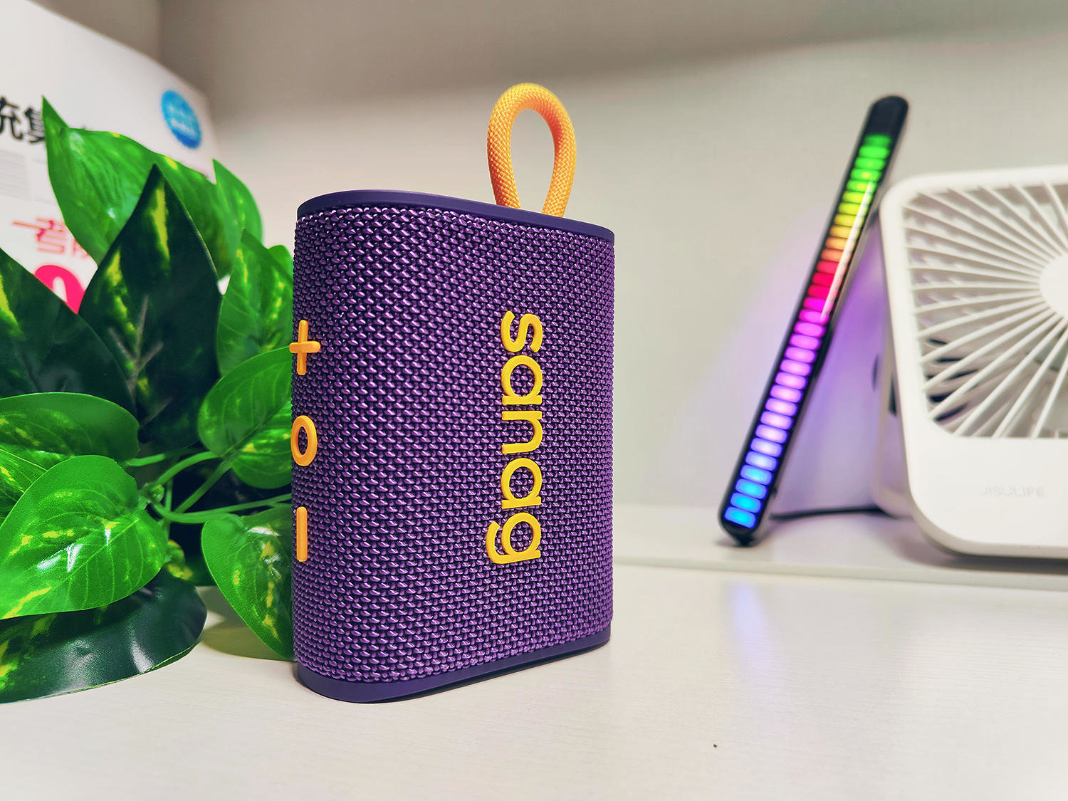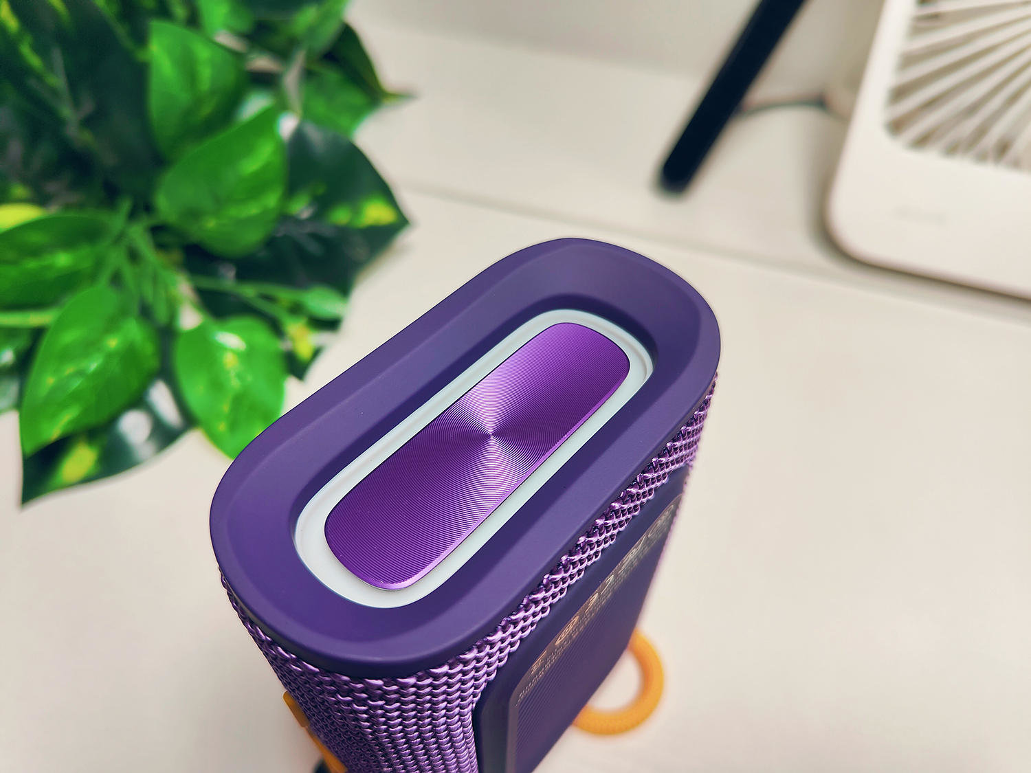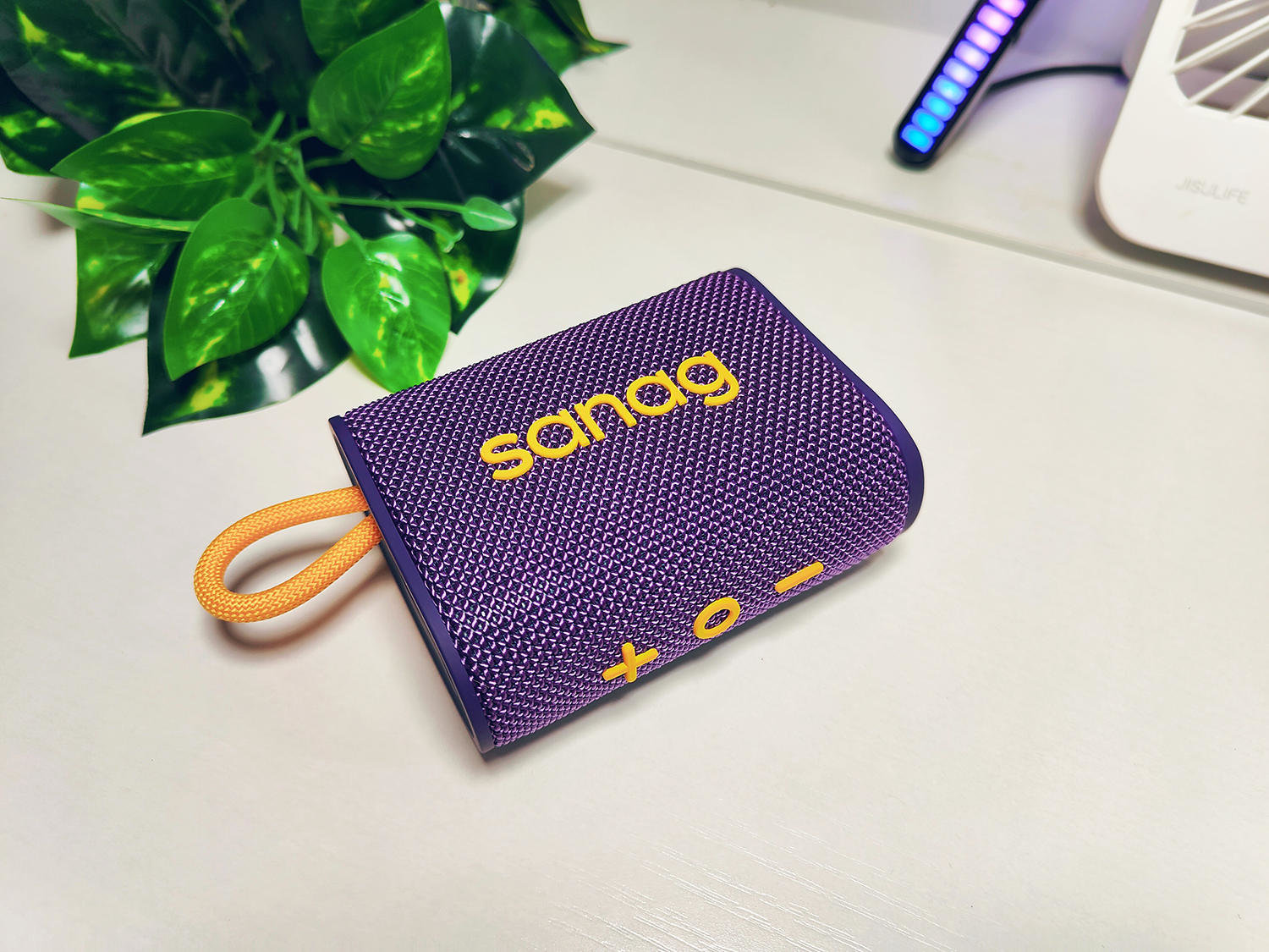 这台小音箱的整体外观给人以一种户外的感觉,表面采用了织物纹理设计,整体紫色的机身加上黄色的点缀,拿到手上那是满满的质感,颜值相当高,另外这个款还有绿色,橙色,蓝色等颜色可选,给消费者更多的选择。