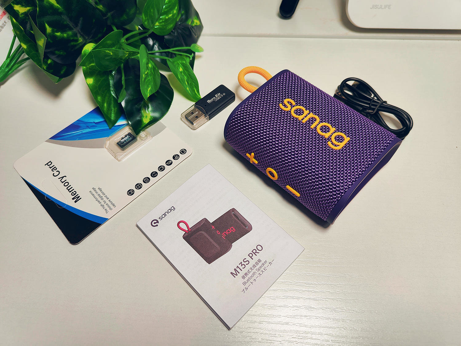 由于某些音乐的版权问题需要使用多个软件,所以为了方便,我都是把歌曲下载的本地,这次我购买的Sanag M13S PRO蓝牙音箱直接就买了带内存卡的套装版,收到货后的全部产品为下图,包括音箱本体,一份说明书,一条数据线以及套装中的TF卡和读卡器。