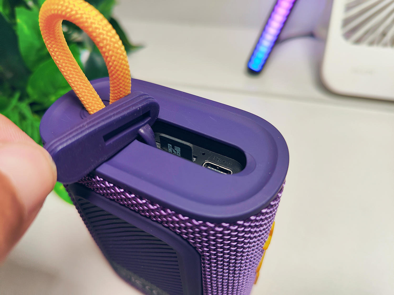 Sanag M13S PRO蓝牙音箱的顶部设计了基本上是户外音箱标志的手绳,另外还有一块很紧很厚的硅胶盖子,下面保护着TF卡槽和TYPE-C充电接口,也正是有了这样的保护,Sanag M13S PRO蓝牙音箱才能拥有了IPX7级的防水,保证了户外使用的安全。而TF内存卡的设计,则能够让音箱无需连接手机等蓝牙,自身作为一个独立的音乐播放器进行使用,更好的适应户外的各种没网等情况。