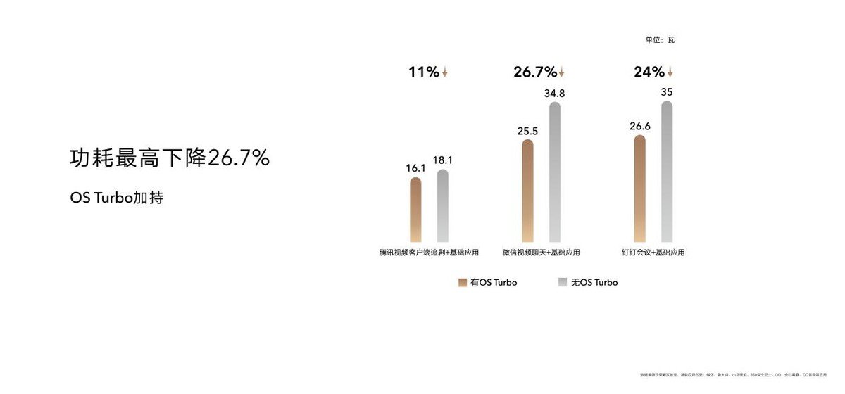 OS Turbo是荣耀从消费者痛点需求出发,带来续航和性能兼顾的最佳解决方案。在OS Turbo加持下,荣耀MagicBook V 14 2022 在钉钉会议、腾讯视频客户端追剧以及微信视频聊天等日常场景下,功耗最高下降达26.7%。