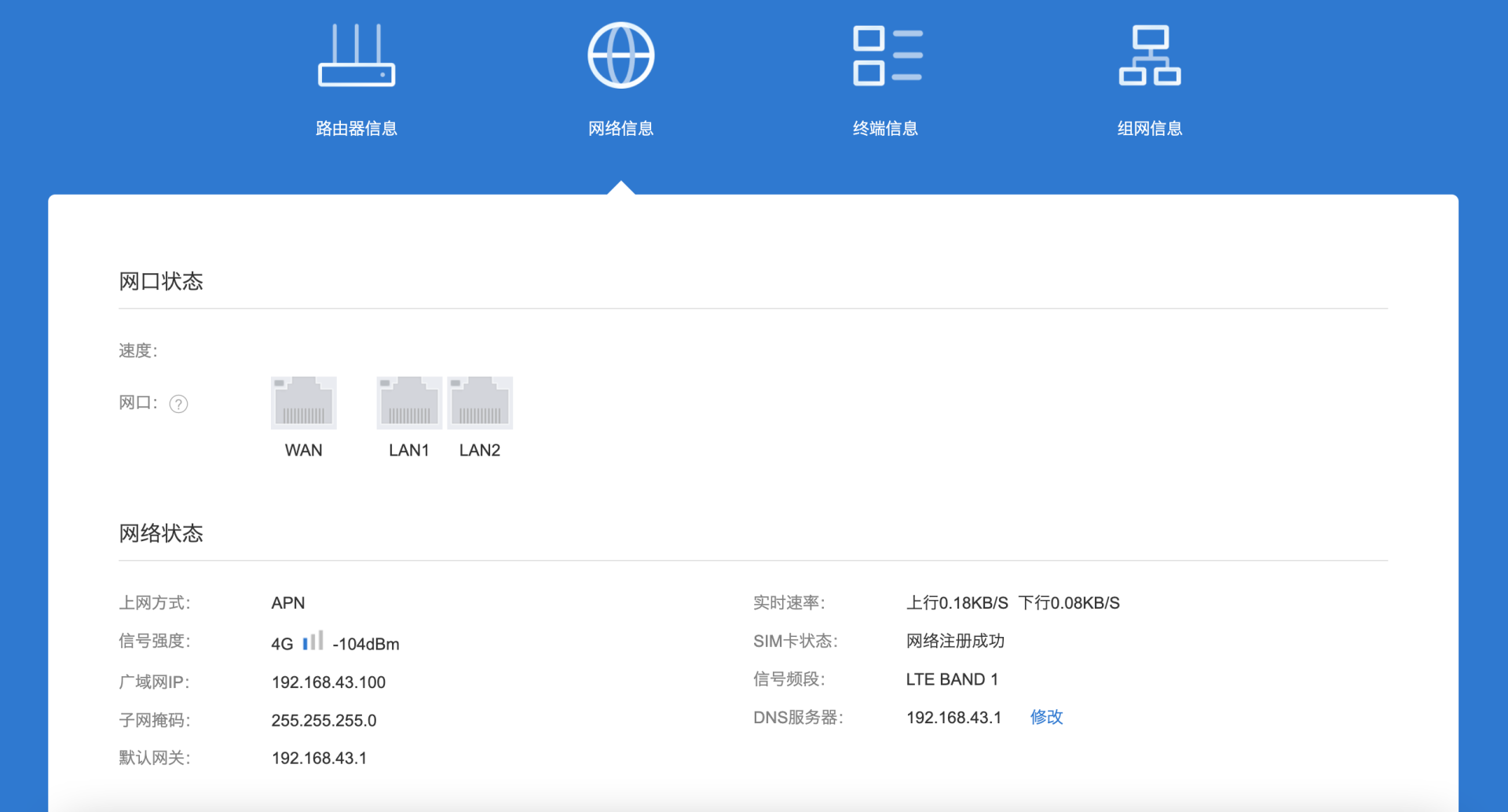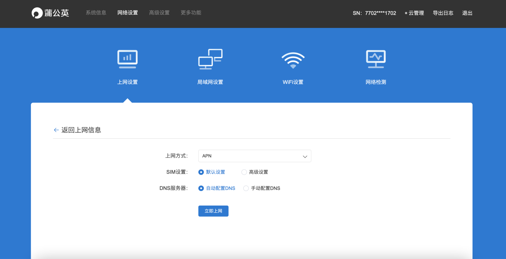默认的本地管理页面地址为10.168.1.1,如果需要组网的话需要修改一下局域网地址,以免两个网络内的IP地址冲突,管理页面主要分为本地后台和云端管理页面,首先登陆本地管理页面设置宽带接入方式,可以看到比普通路由器多出了APN(4G)连入方式。