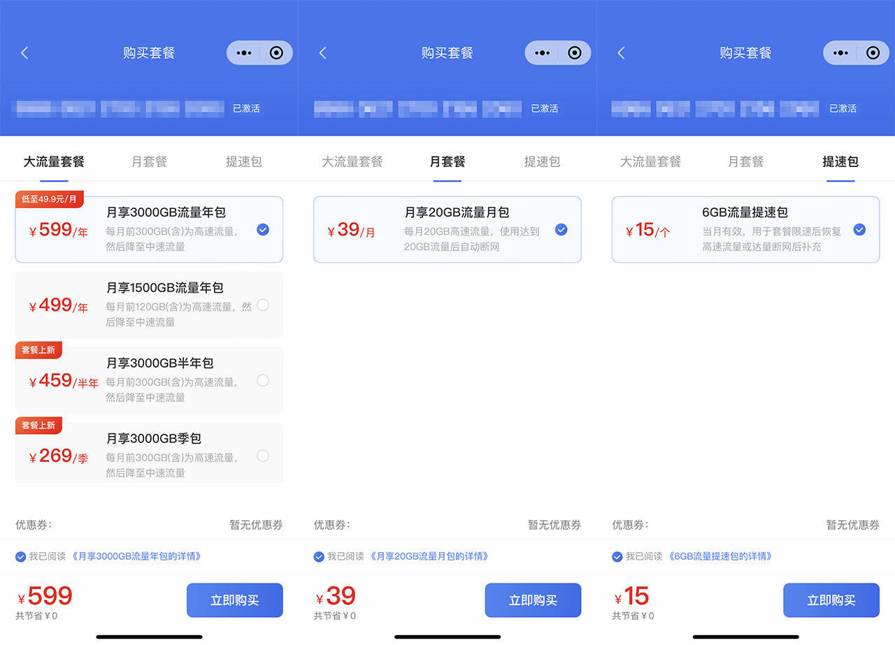 上网卡附赠了3天的流量体验包,后续可以按照提示页面购买流量套餐使用,附带的套餐既有适用于主力接入的大流量套餐,也有适合作为备用链路应急使用的档位可选,在有线接入的状态下,当有线网络中断时会自动切换到4G上网状态,确保业务不受网络中断影响。