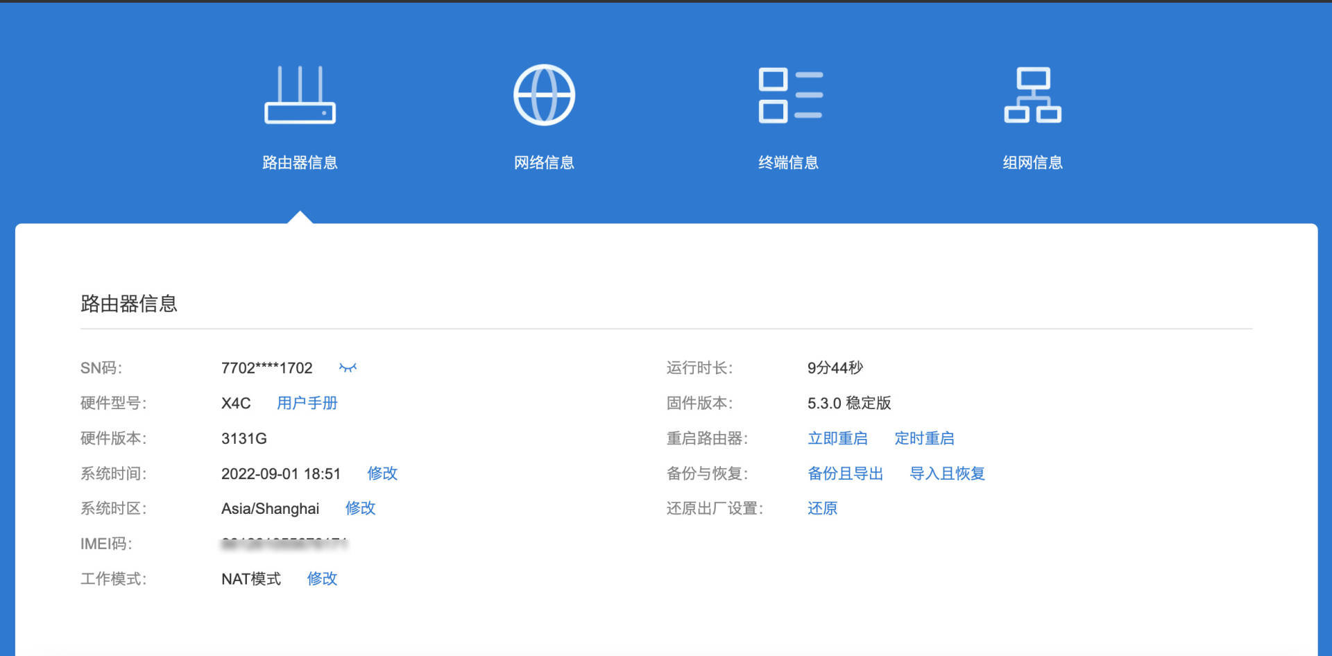 路由器信息页面,可以修改工作模式,备份配置信息等。