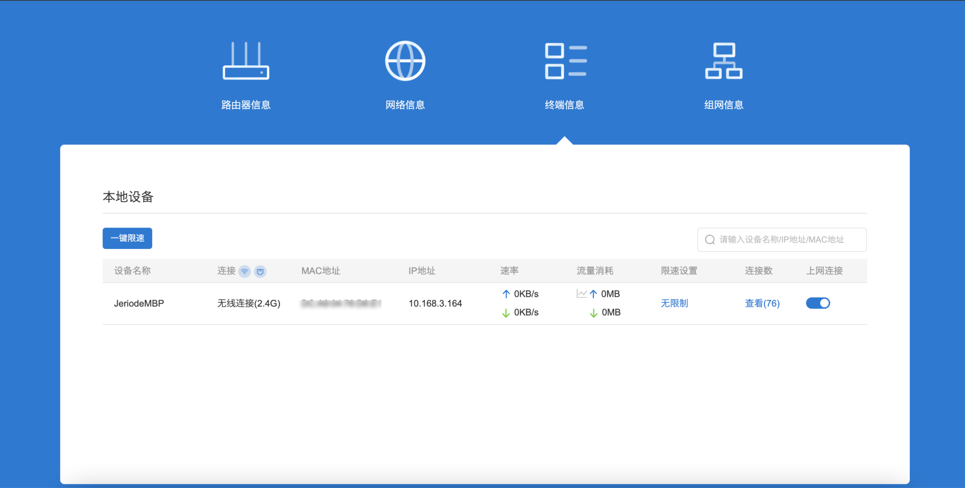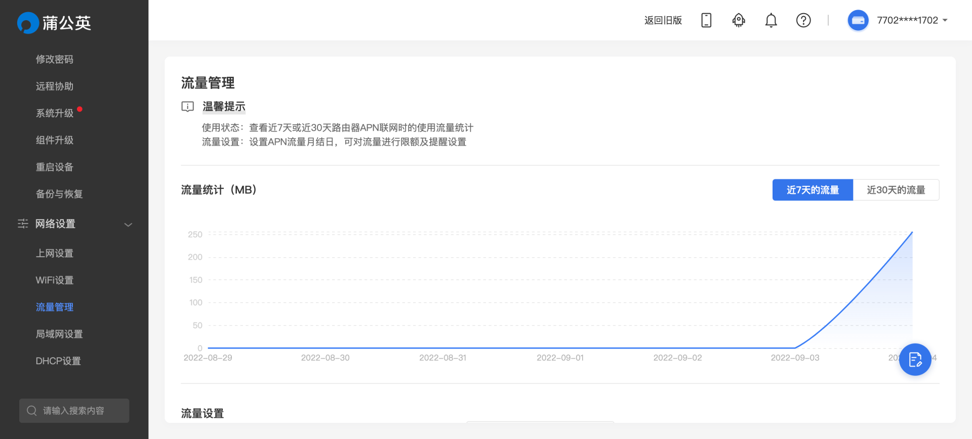 云端管理页面可以设置除了上网方式以外的大部分功能,在流量管理页面可以看到实时的上网卡流量消耗统计,可以根据相关数据合理安排流量使用。