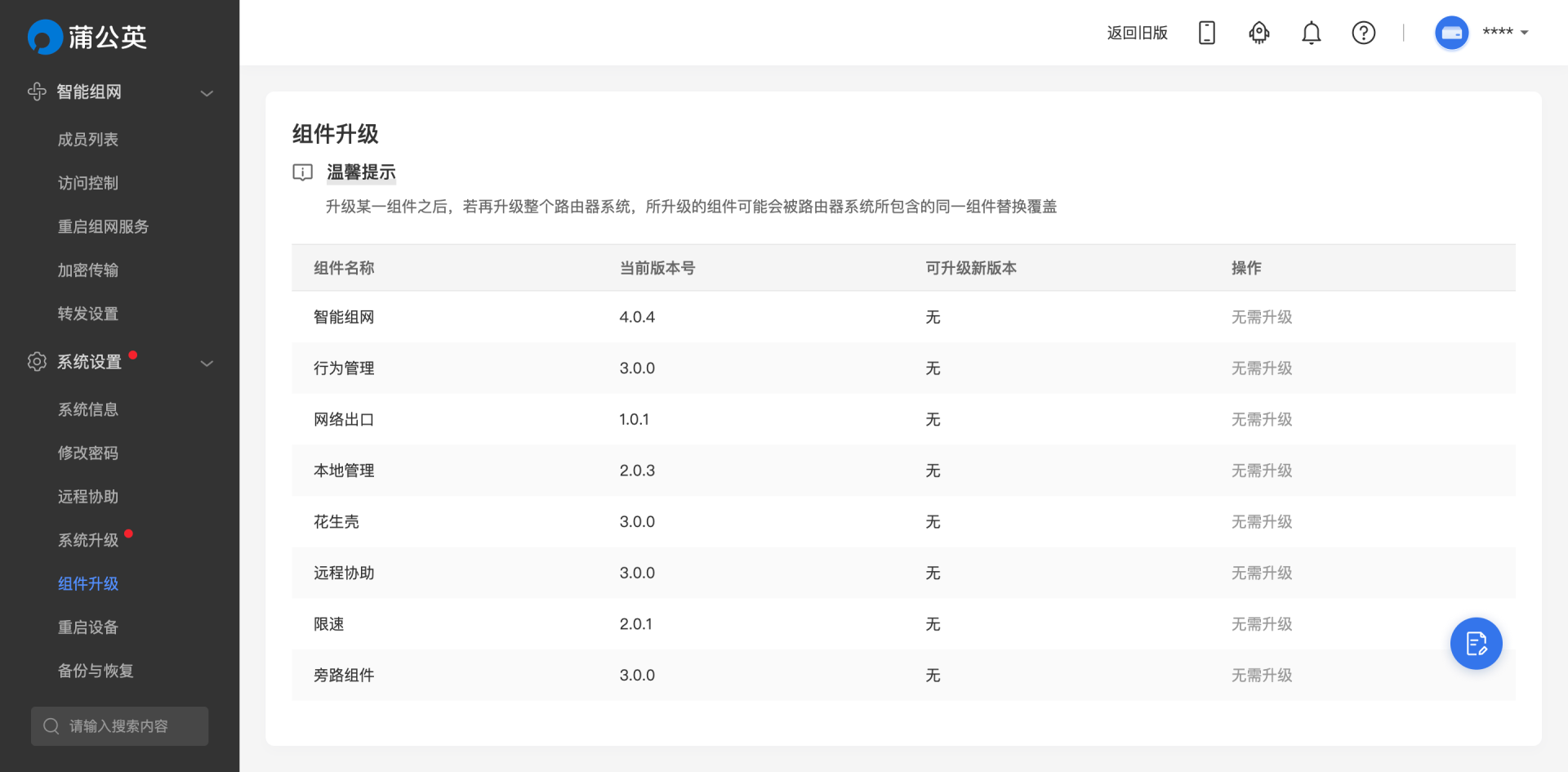 蒲公英的各项功能使用模块化管理,在组件升级页面可以看到各个模块的版本信息。