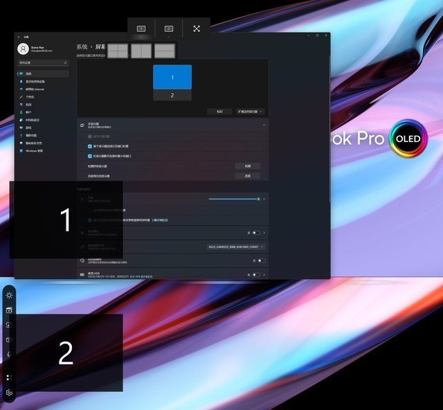 在介绍这些使用场景之前,我们先来简单介绍一下这块副屏的配套软件。华硕为了提高这块副屏的使用体验,为其特意打造了ScreenXpert 3软件,让跨屏操作更加流畅,通过ScreenPad Plus右侧的设置栏,我们可以实现多种快捷操作,在这里列举几个我比较常用的功能,比如亮度调节、一键关闭麦克风、摄像头;