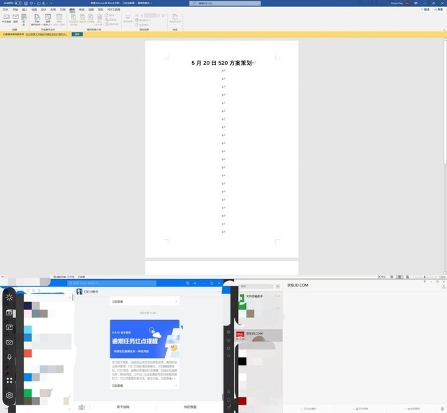 这里列举出两三个例子,比如在使用Word时,将微信和钉钉这两个交流工具移至副屏,方便查看新的消息,主屏则专注于码字。又比如说,我们在线上开会时,将会议软件放到副屏,主屏打开word文档进行记录;又或者在主屏中浏览PDF文献、资料,而在副屏中记录关键要点。