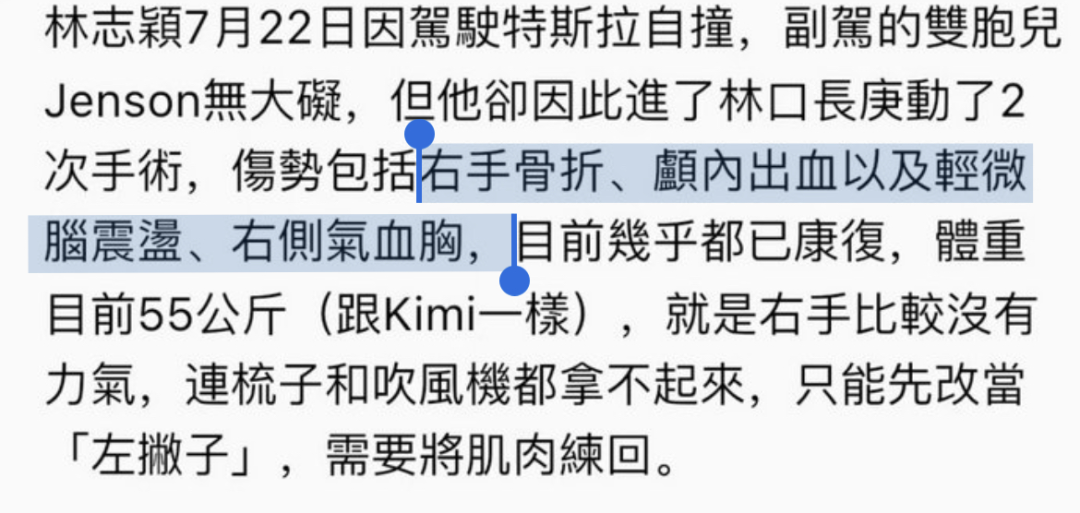 林志颖还透露自己的体重和kimi差不多,55公斤,还在慢慢恢复中,可想而知,因为车祸,林志颖真的承受了太多,不少林志颖的粉丝听到这个消息,都十分心疼。