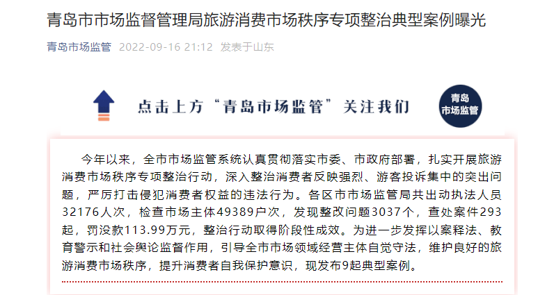 今年以来,全市市场监管系统认真贯彻落实市委、市政府部署,扎实开展旅游消费市场秩序专项整治行动,深入整治消费者反映强烈、游客投诉集中的突出问题,严厉打击侵犯消费者权益的违法行为。青岛各区市市场监管局共出动执法人员32176人次,检查市场主体49389户次,发现整改问题3037个,查处案件293起,罚没款113.99万元,整治行动取得阶段性成效。为进一步发挥以案释法、教育警示和社会舆论监督作用,引导全市市场领域经营主体自觉守法,维护良好的旅游消费市场秩序,提升消费者自我保护意识,现发布9起典型案例。