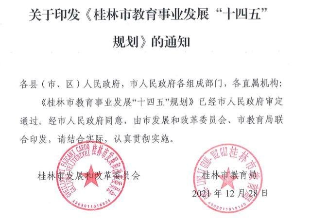 今年初的时候,桂林市发展改革委、桂林市教育局联合印发的《桂林市教育事业发展“十四五”规划》提出,全市计划投资 67.24 亿元,新建义务教育学校 75 所,新增学位 10.7 万个;计划投资 34.33 亿元,改扩建义务教育学校 279所,新增学位 6.6 万个。