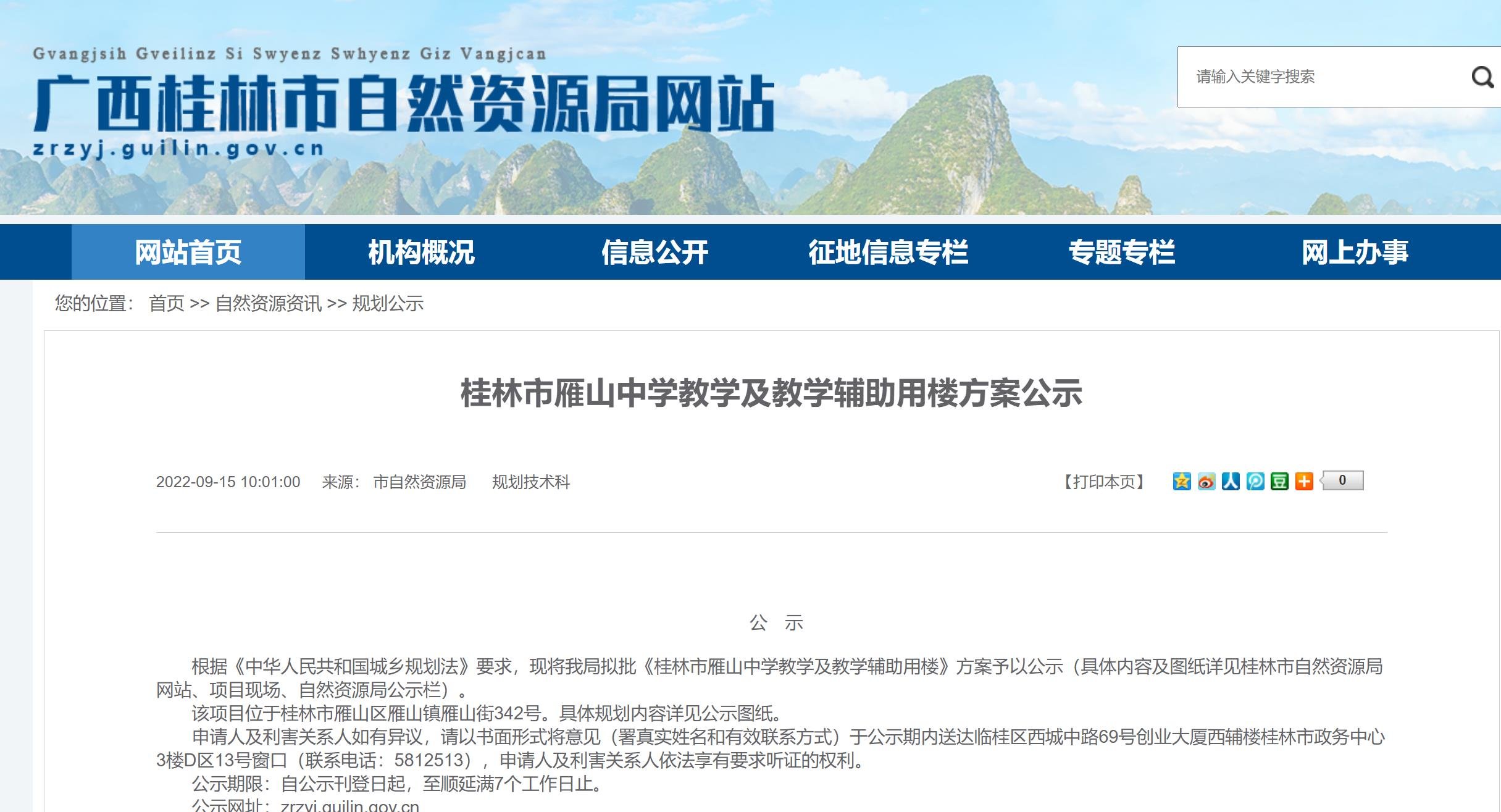 乐居买房讯 近日,桂林教育建设动作频频。9月16日,桂林市自然资源局发布了《桂林市雁山中学教学及教学辅助用楼方案公示》。