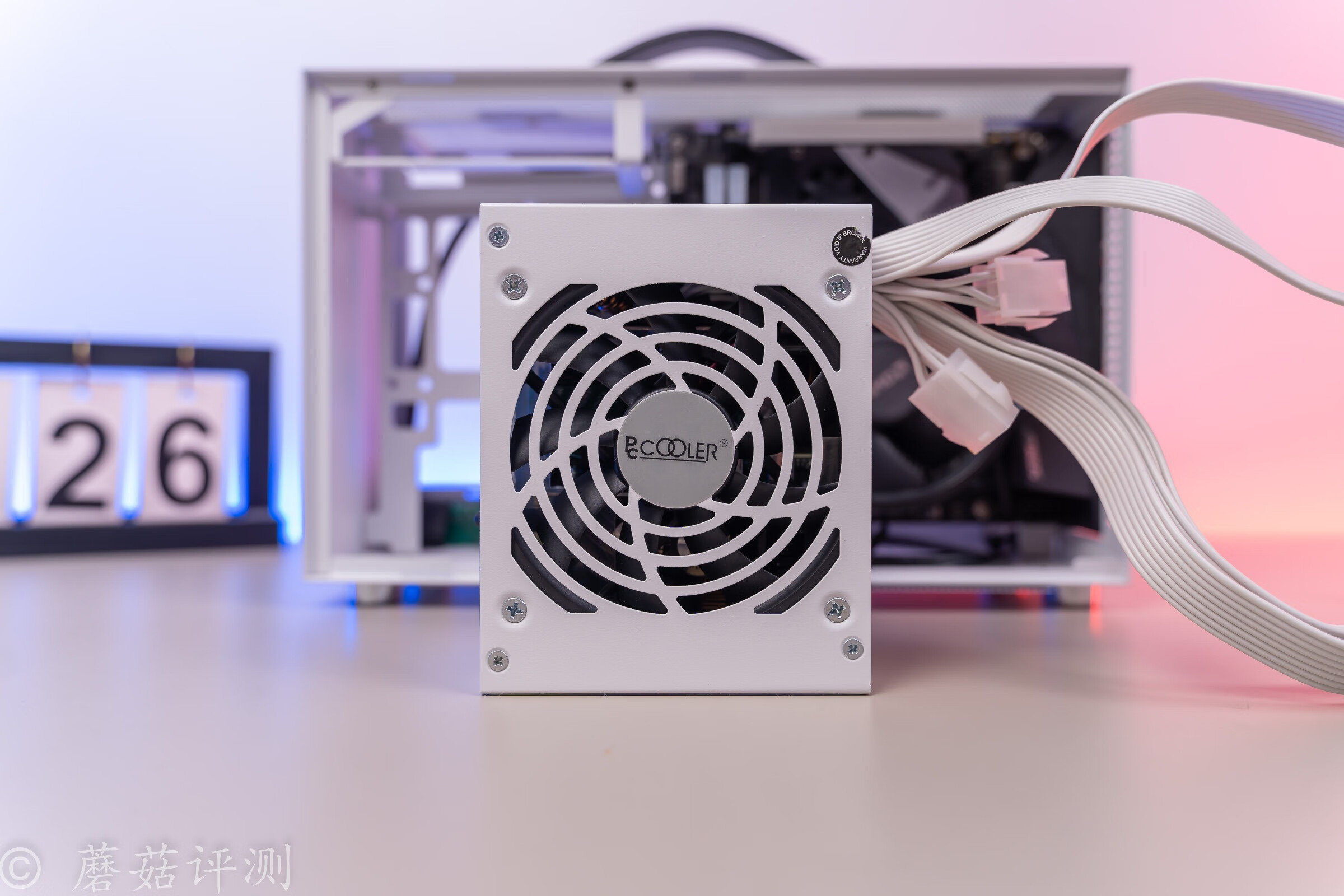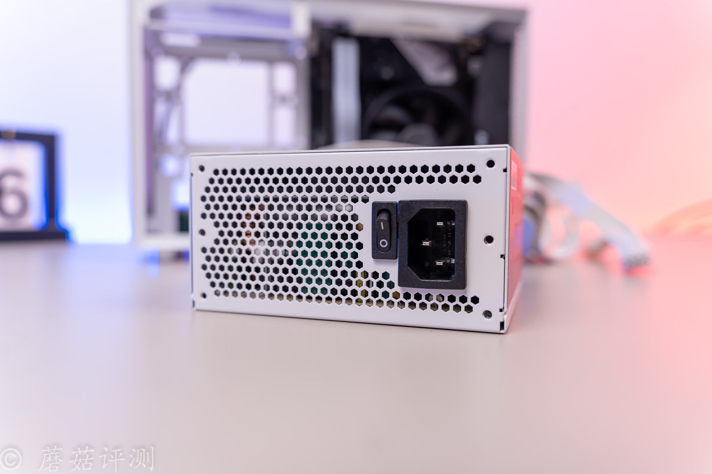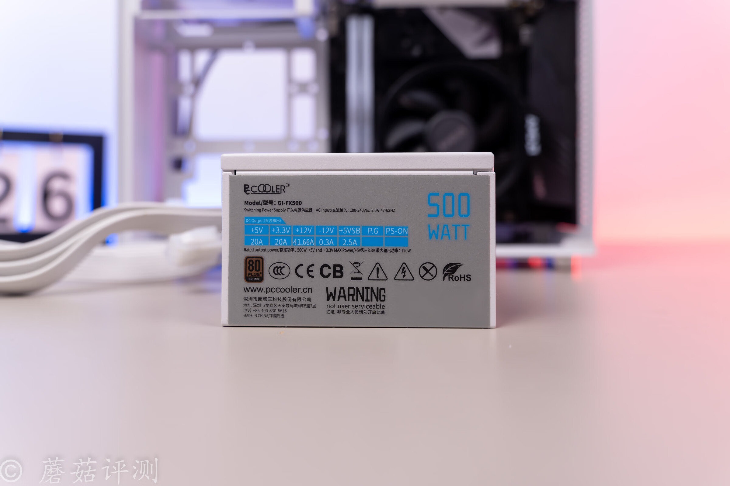 ▼接着安装电源,SFX规格的电源。这里选择了超频三的GI-FX500,这款SFX规格的电源还是挺不错的,性价比很高。电源侧面有标签,这款电源最大支持额定500W的输出功率,其中+12V的单路最大输出在499.92W,还是很不错的。