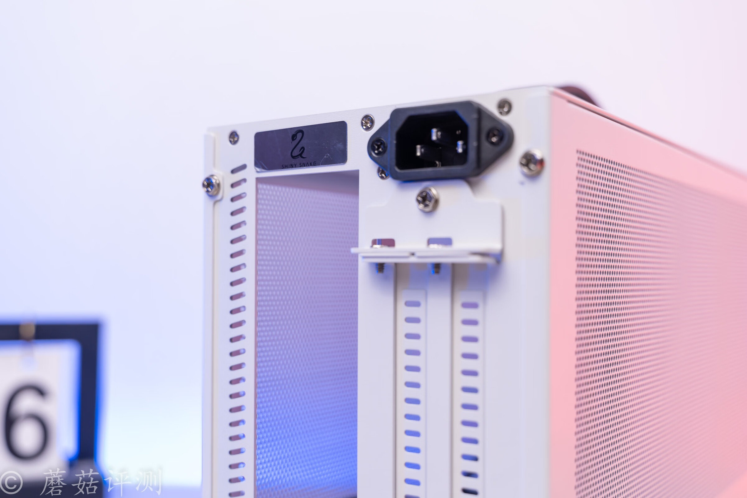 ▼机箱的尾部,熟悉的背靠背结构的ITX机箱,左侧是主板的IO开口,右侧是显卡的PCIe挡板,顶部有电源的延长接口。