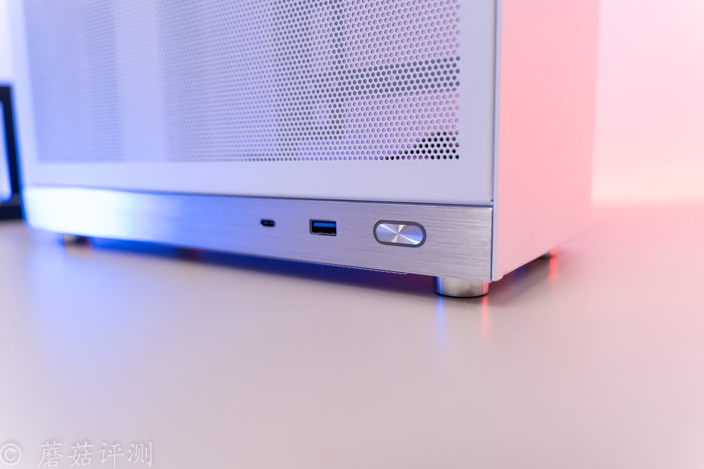 机箱的IO接口方面,放在了机箱的侧面,有独立的铝合金金属条装饰,质感很不错。接口方面有一个USB Type-A、一个USB Type-C接口,方便日常使用。