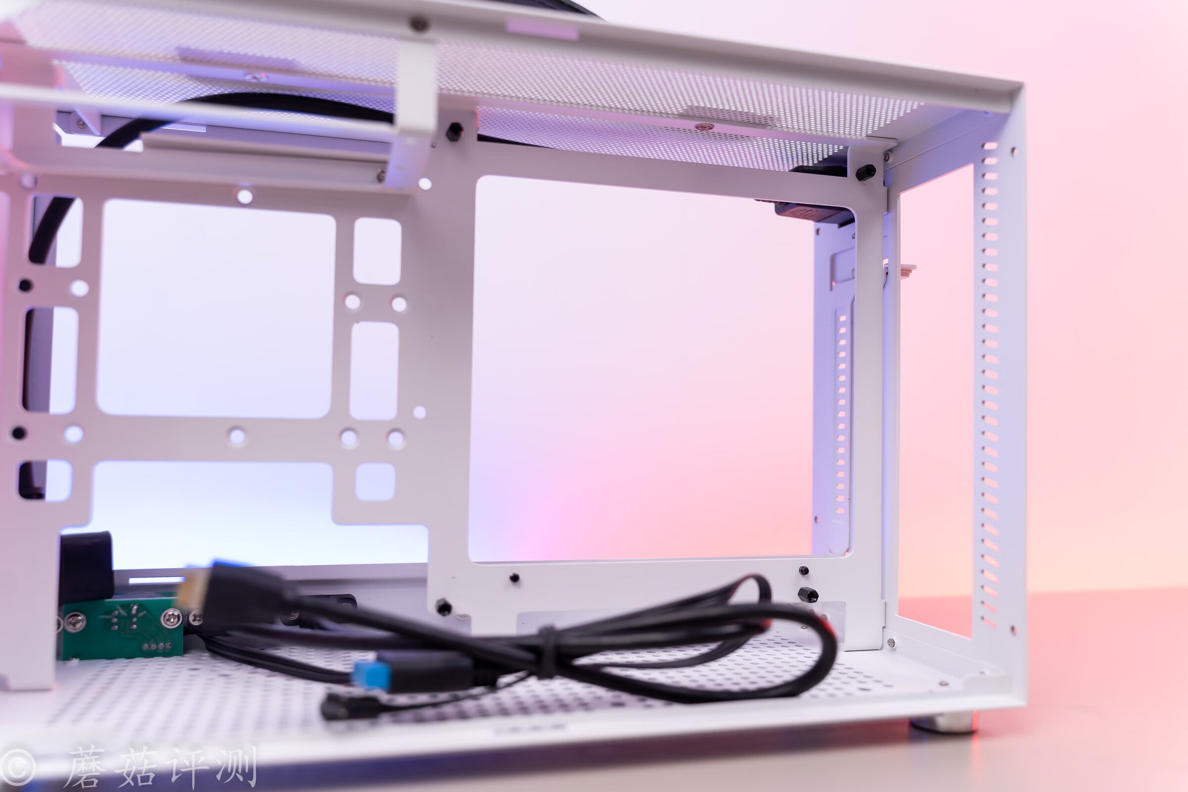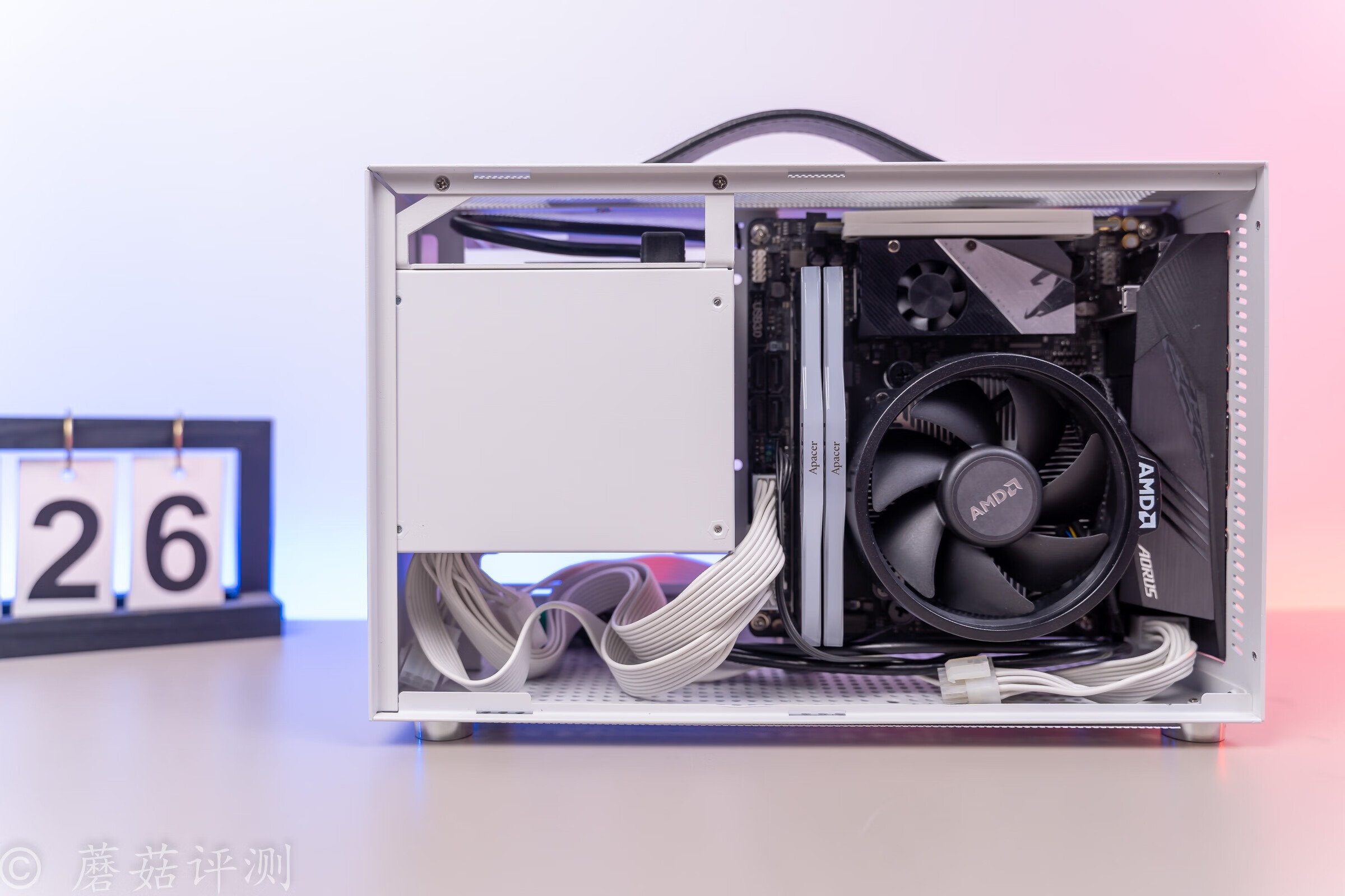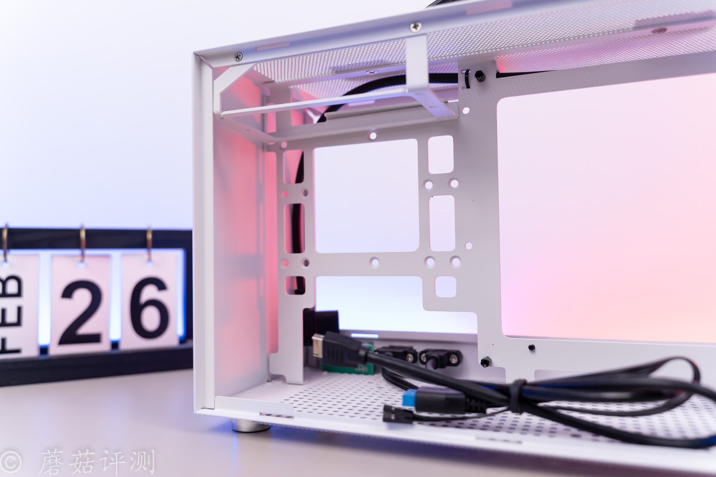 机箱的内部设计方面还是挺有意思的,主板和显卡背靠背,主板旁边固定SFX规格的电源。而在电源的背面,有硬盘的固定孔位,这里可以安装固定硬盘,方便拓展存储。