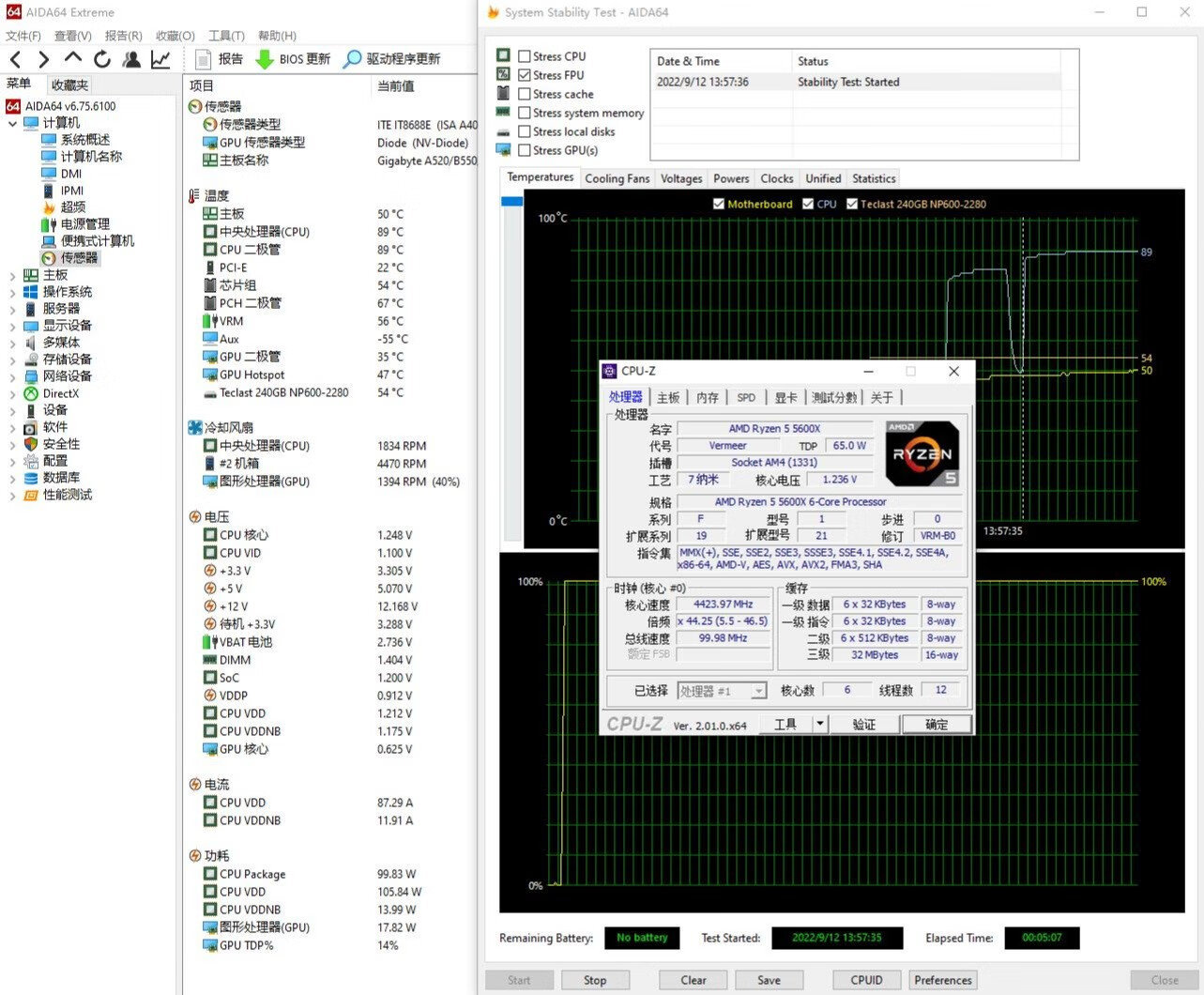 ▼单烤FPU测试,处理器功耗在100W左右,全核心睿频4.45GHz,温度89℃,AMD的原装散热就这水平。