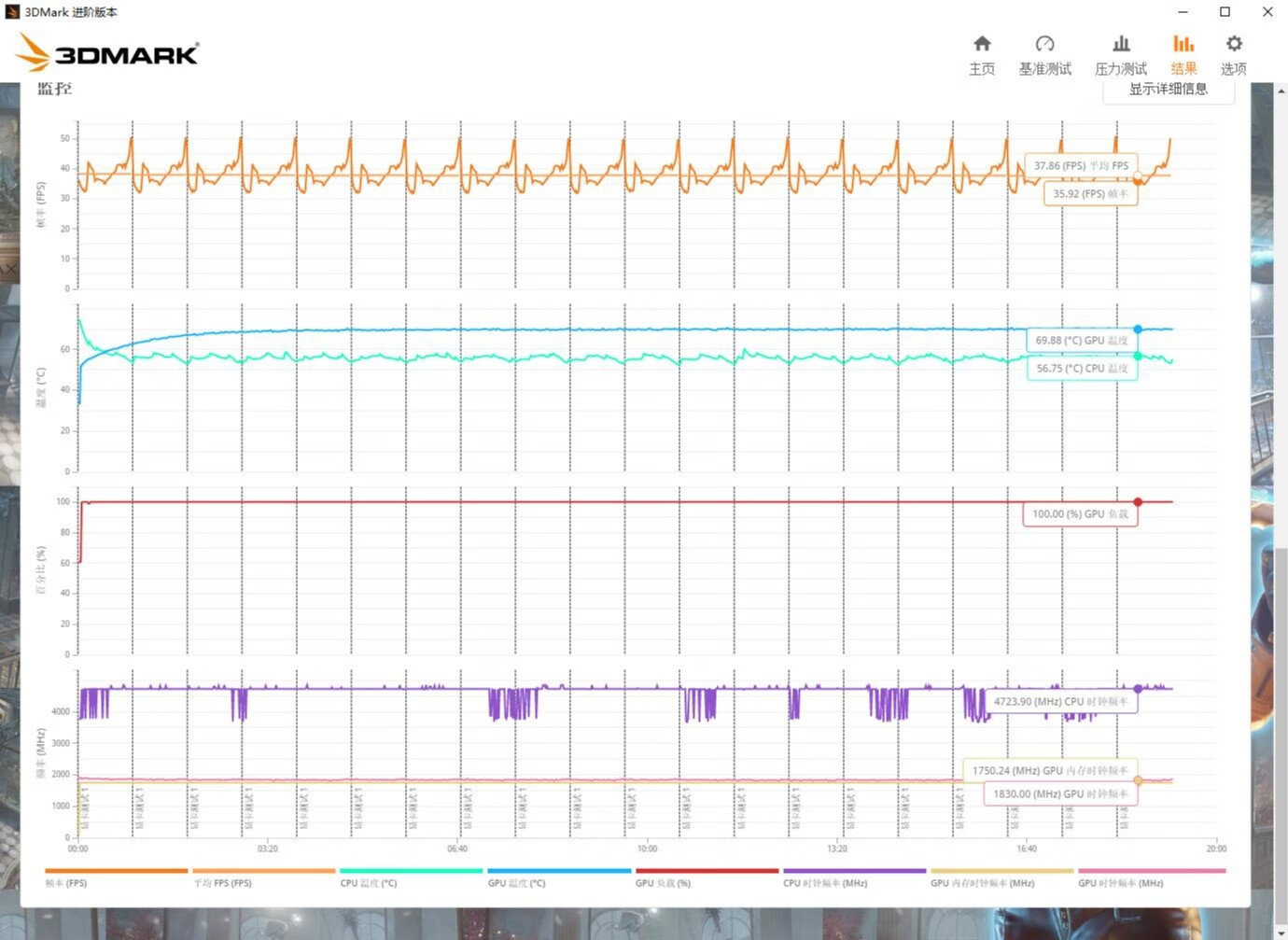 ▼跑个3Dmark的压力测试,TS模式,帧数稳定率在98.4%左右,表现不错。