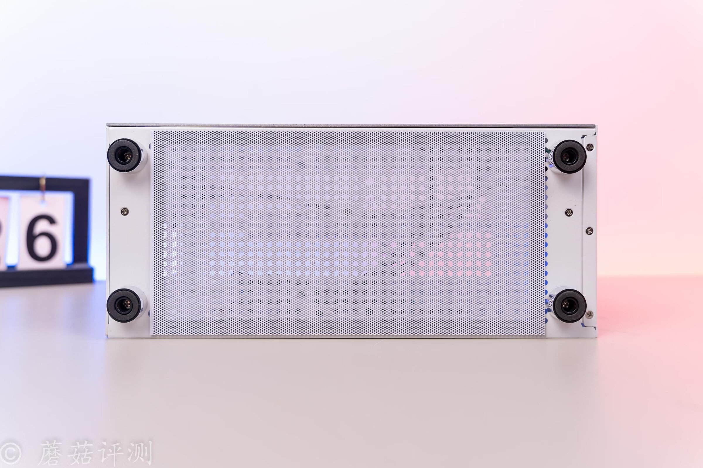 ▼机箱底部,四角有四个泡棉防滑脚垫,中间是磁吸的金属防尘网,面积挺大。