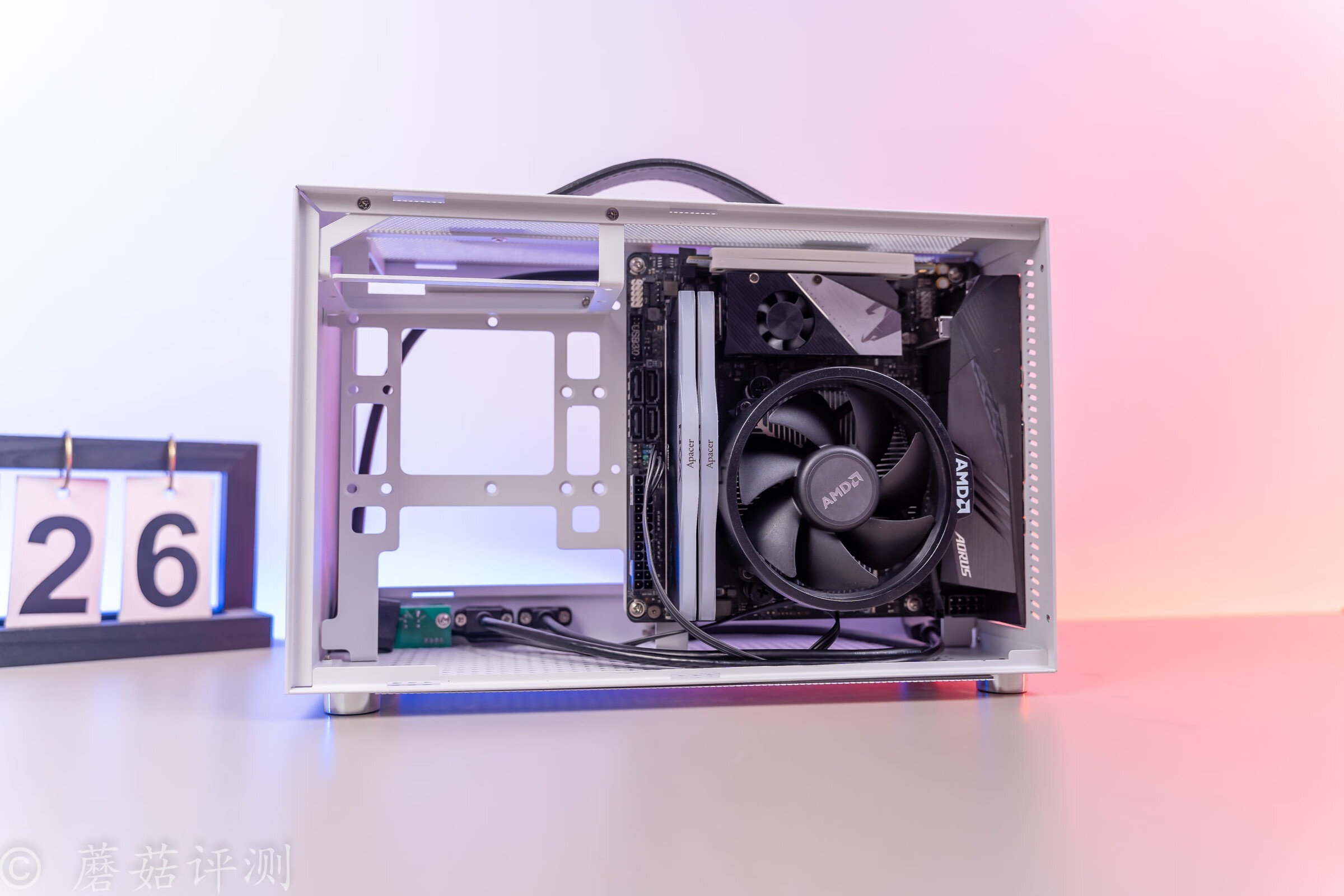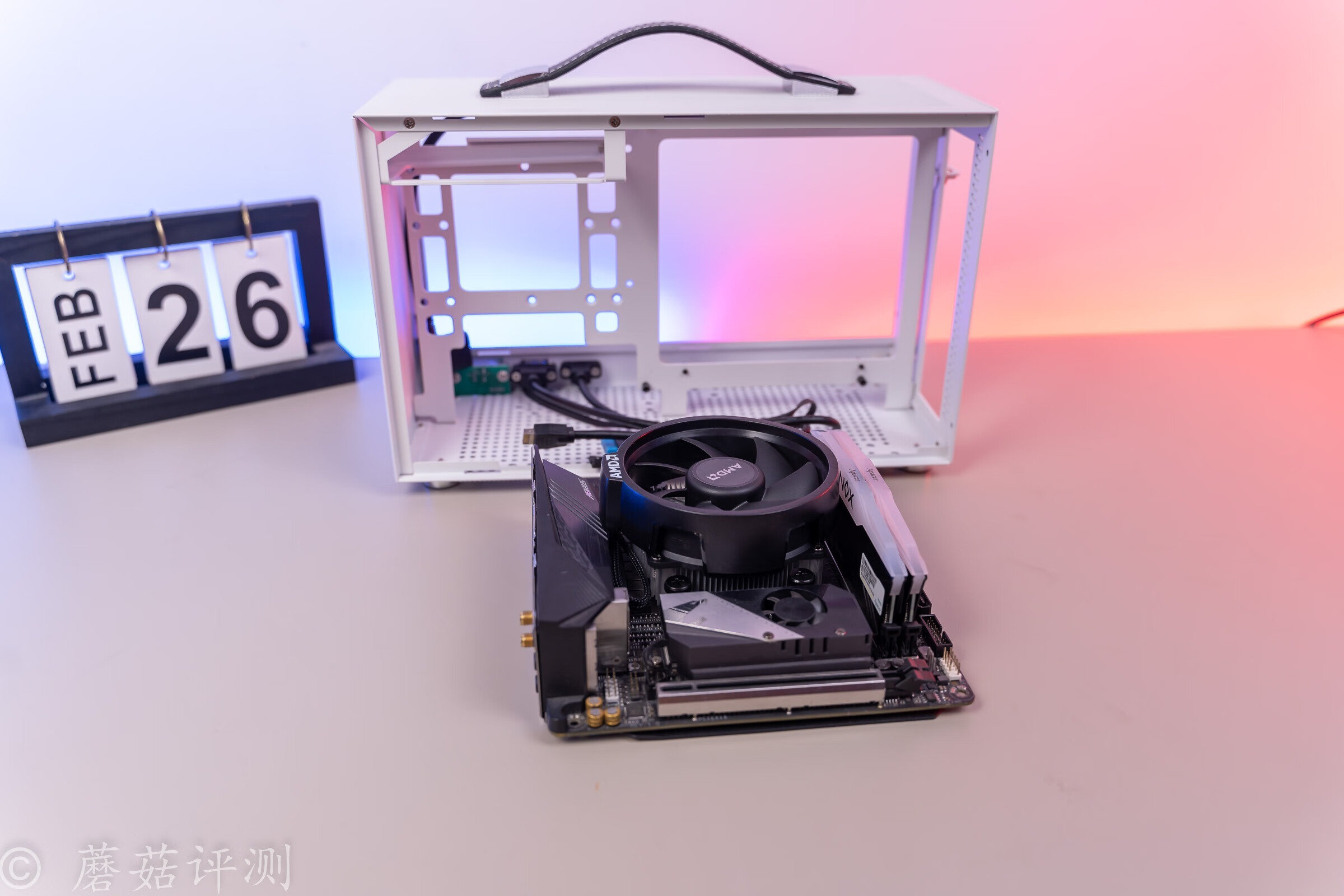 ▼接着装机试试看,将安装好处理器、散热、内存、固态的ITX主板塞进机箱。