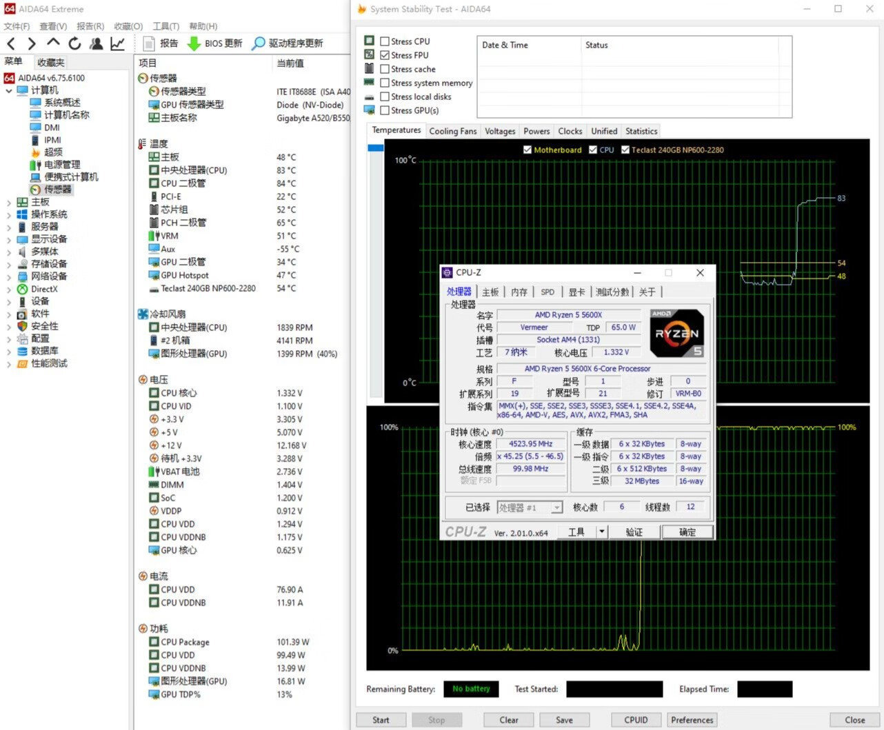 ▼简单跑个CPU-Z的压力测试,开了PBO2,处理器功耗101W,全核心睿频4.55GHz,温度83℃,还可以。
