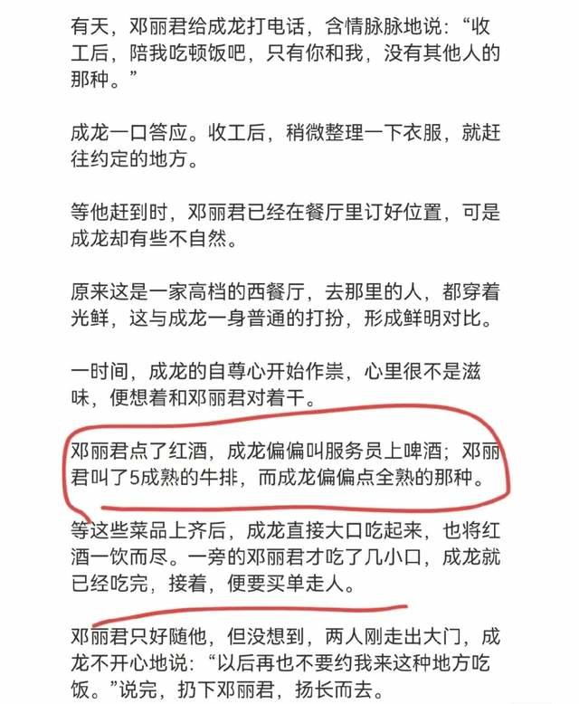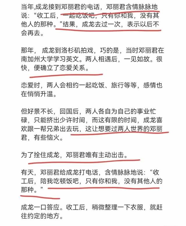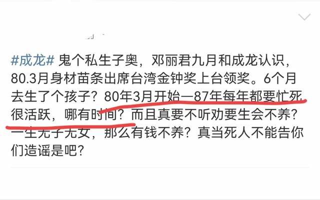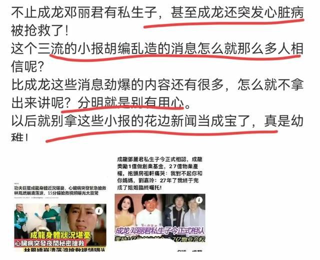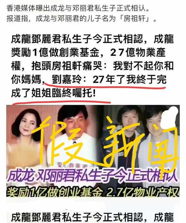 入行这么多年,第一次感受到港媒(娱乐媒体)造谣得如此没有底线——说成龙认下了他与邓丽君多年之前生下的私生子,还给了对方将近28亿的创业基金和物业资产,关键是认亲画面的场面和对话,都详细描述出来了——抱头痛哭,我对不起你!