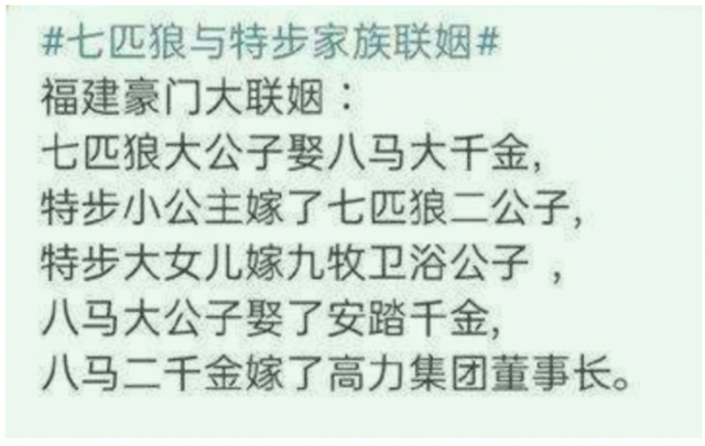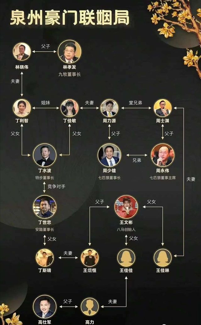 今天小编带大家捋捋泉州富豪联姻局,除了八马,七匹狼,特步,安踏,高力这一组总值800亿身家的姻亲圈;