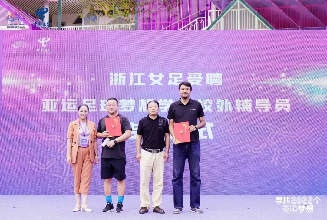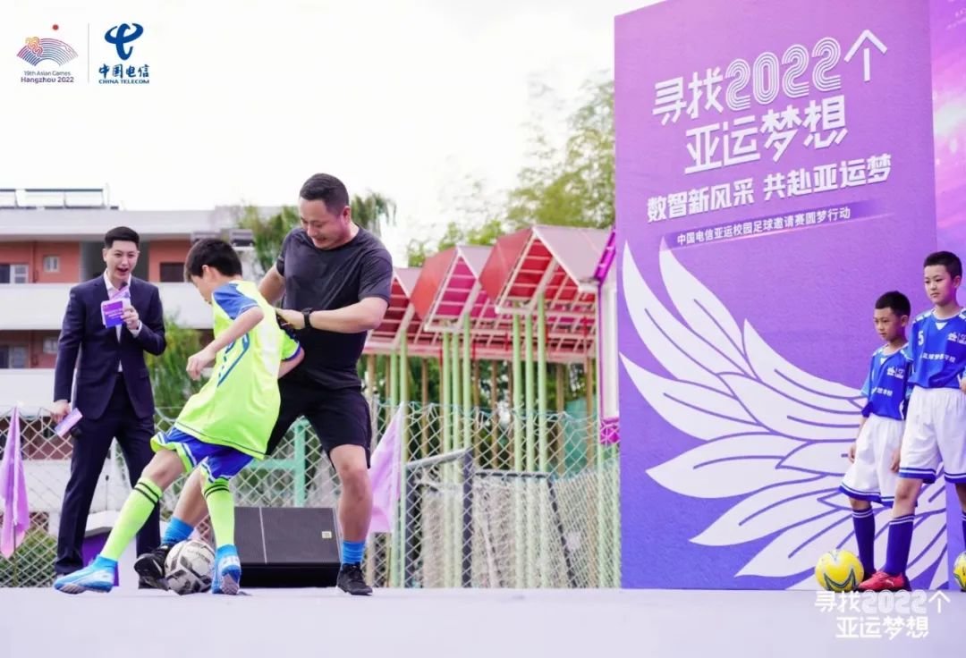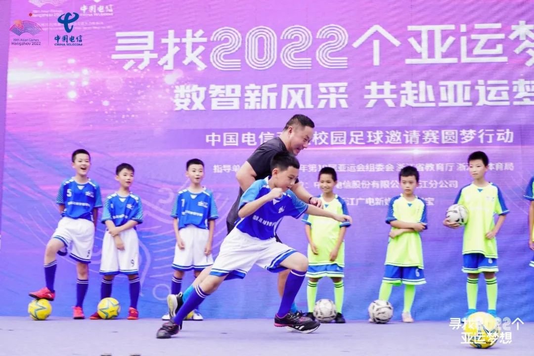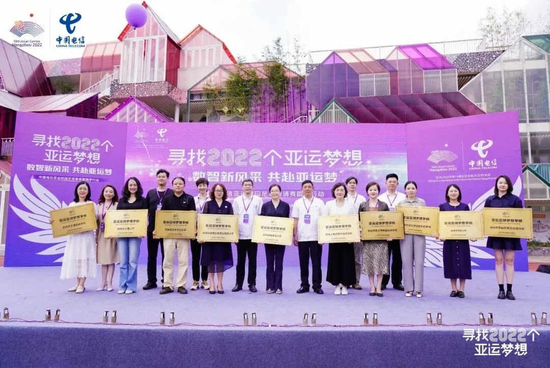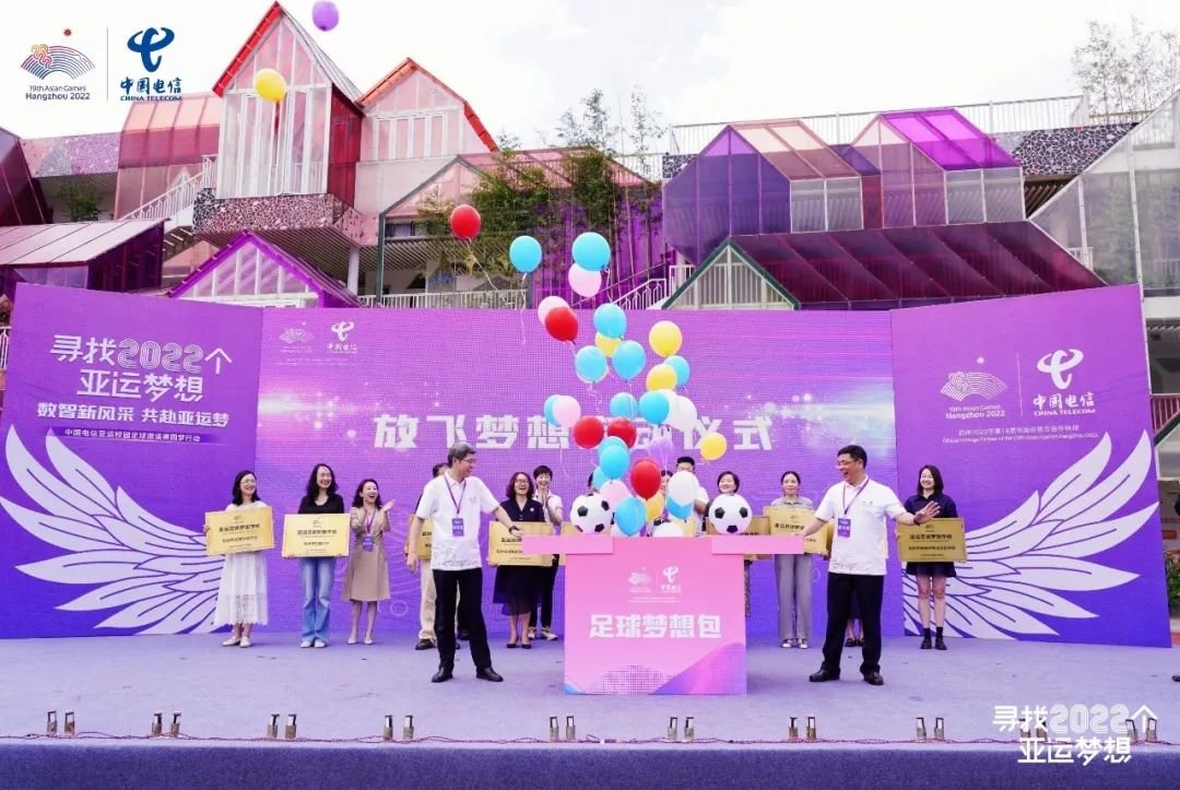 中国电信现场宣布支持捐助浙江全省100所中小学亚运足球梦想学校,为百所学校提供足球、训练器械等“足球梦想包”,助力校园均衡发展体育项目,点燃足球梦想,传播亚运精神和以体树人教育理念。
