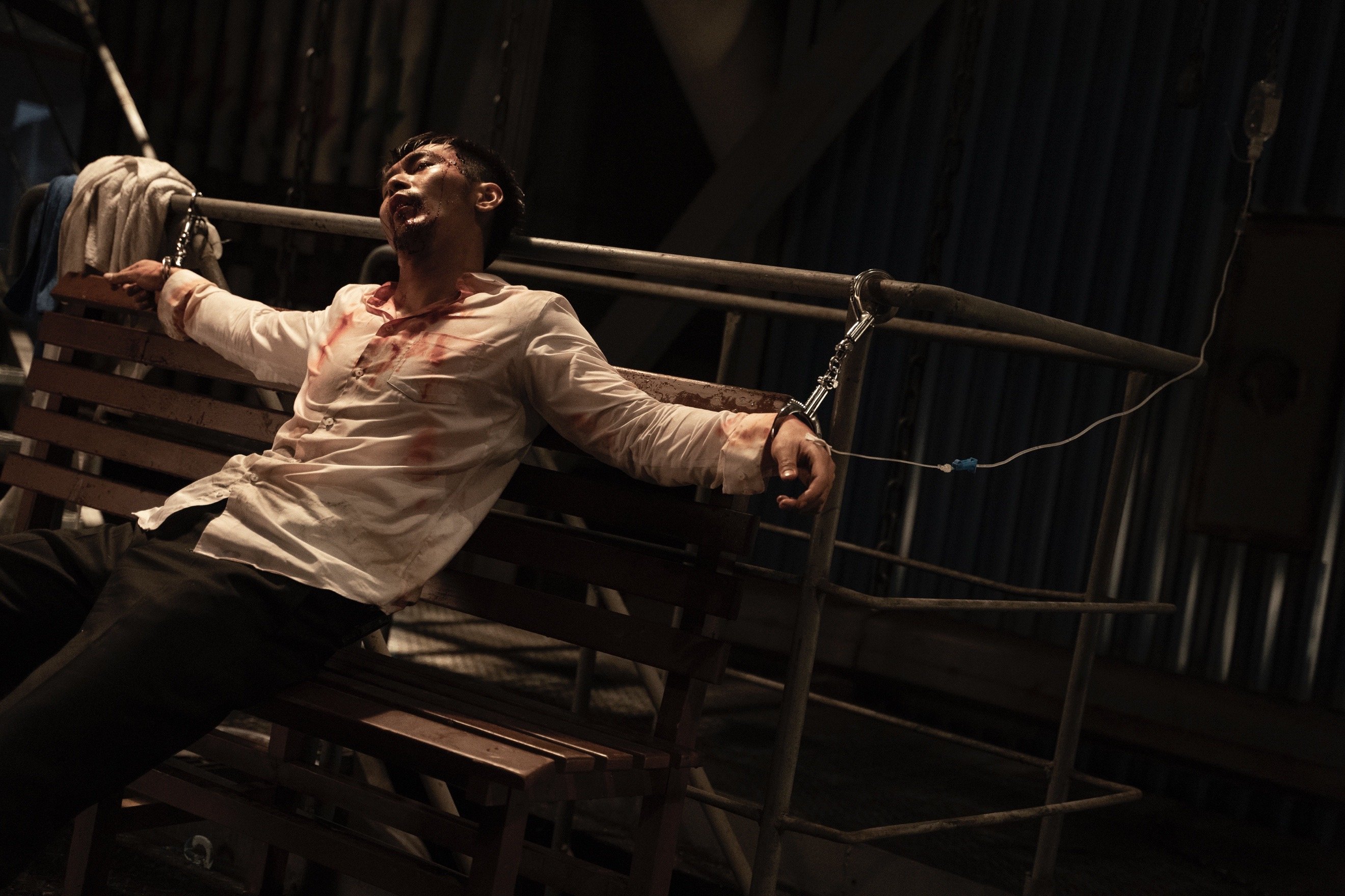 很佩服勇哥把动作戏都拍得那么利落好看,他是非常清楚自己要什么的。有时候在现场看勇哥拍动作戏或者大场面,我们大多数人是看不懂的,但是他心里是非常清楚的。等最后都剪辑出来,一连串的打戏总是那么流畅漂亮,勇哥所有的设计通盘呈现出来的时候,大家都会被惊艳到。像是邱涛被用刑之后挣脱手铐的那场戏,我怎么掰断手指,把手从铐子里抽出来,与敌人拼搏厮杀,那一整场戏都是勇哥精心设计的。在现场看回放的时候,我就有预感这会是邱涛的高光时刻。