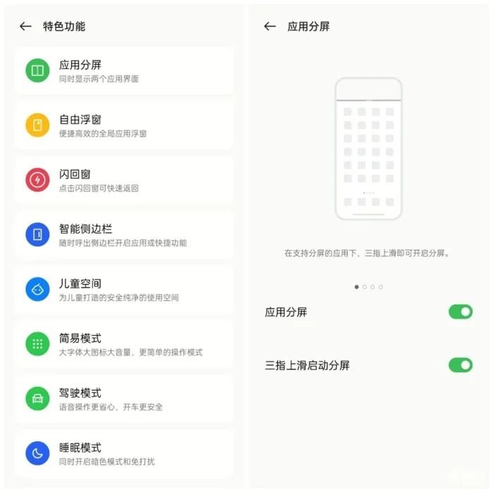 内置的特色功能中,保留了【应用分屏】,在支持分屏的应用下,三指上滑即可开启分屏。而【驾驶模式】开启后,能为我们车主在行车时自动播报来电和信息、屏蔽横幅通知。其他还有【儿童空间】、【闪回窗】、【自由浮窗】等功能体验。