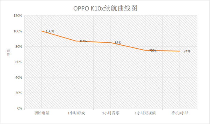 内置5000mAh 超大容量电池,一次充电可带来长达 1.3 天的续航体验。笔者充满100%的电量后,将OPPO K10x置于常规化的设定条件,进行短视频、游戏、音乐各1小时以及待机8小时的续航测试,获得了以下这张续航曲线图。