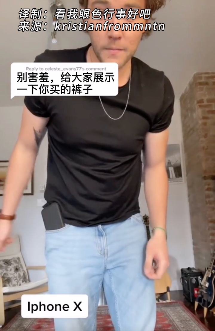 一位博主展示他穿女朋友的牛仔裤,连iPhone都放不进去。