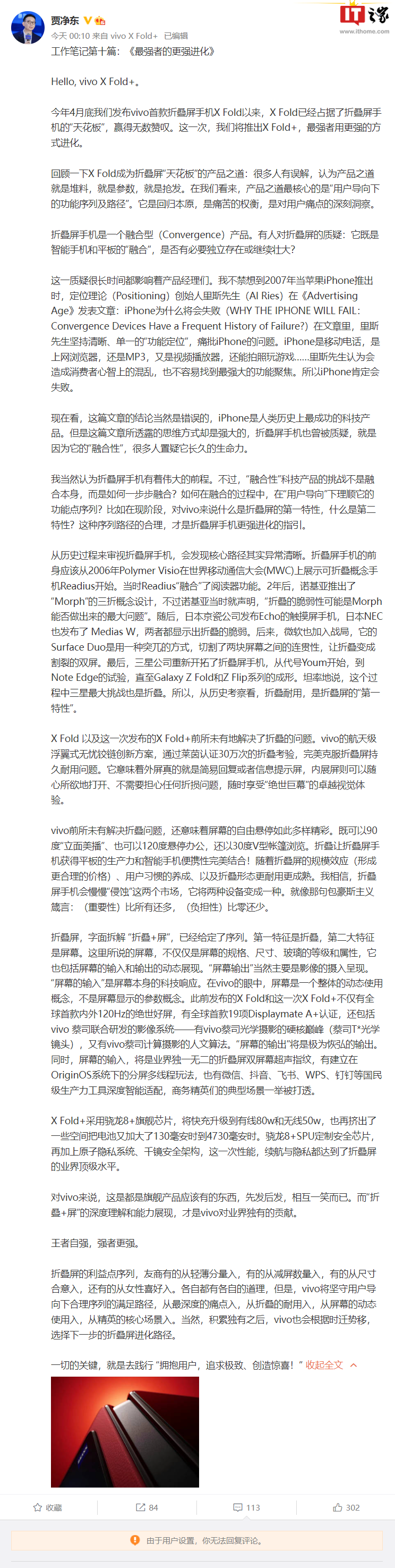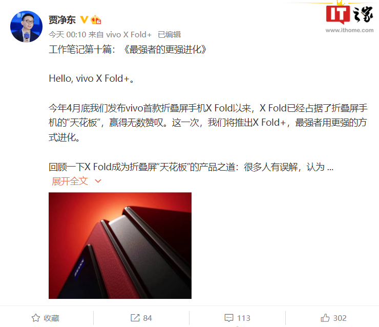 IT之家 9 月 19 日消息,今年 4 月,vivo 推出了 vivo X Fold 折叠屏手机,售价 8999 元起。近日, vivo X Fold 迭代产品 ——vivo X Fold + 折叠屏手机已经现身工信部,并且有消息称该机将于本月底发布。今日,vivo 品牌副总裁,兼品牌与产品战略总经理贾净东在社交平台上发布的 vivo X Fold + 工作笔记,确认了这一消息。