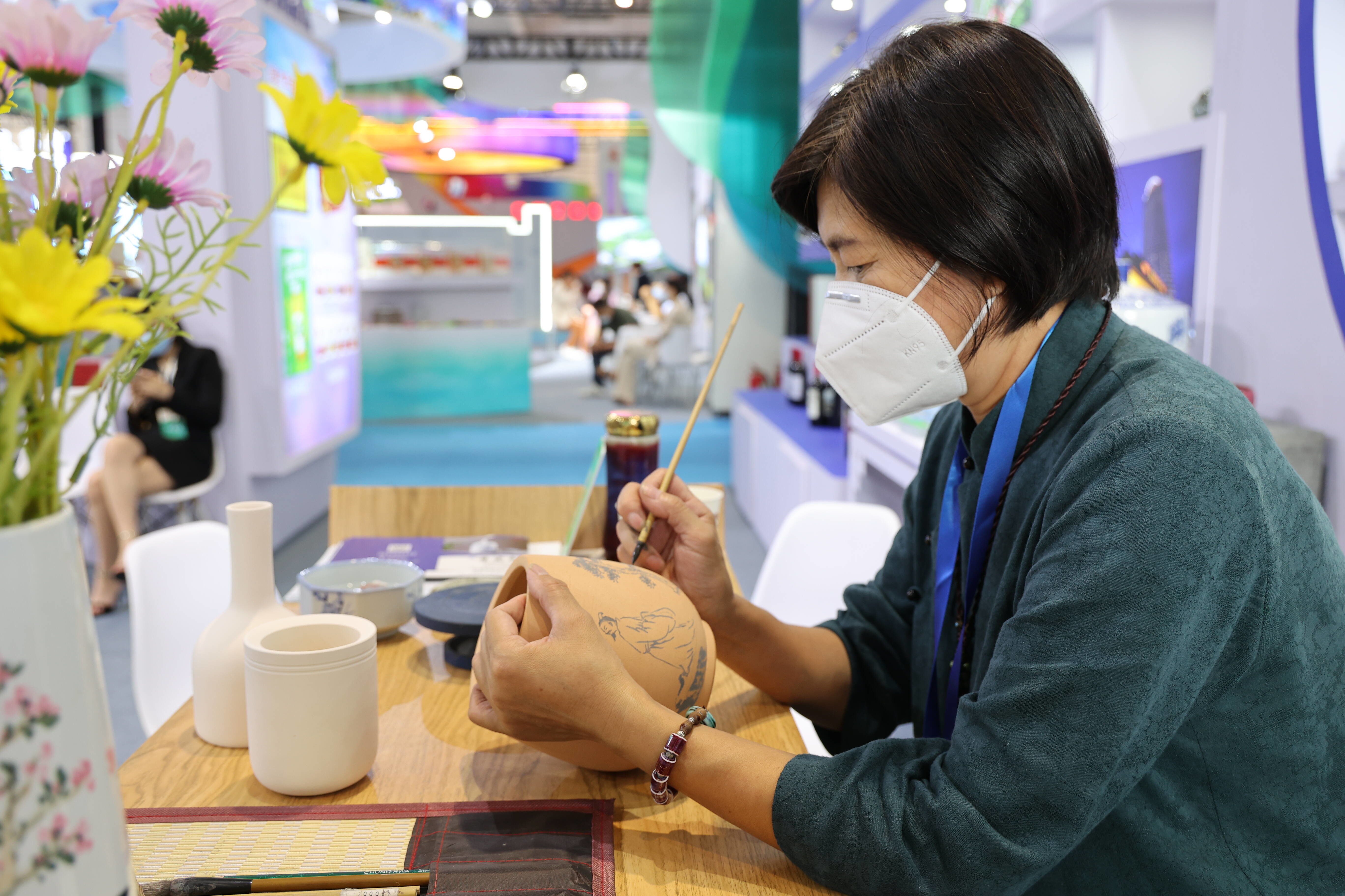 景瓷轩文化创意有限公司总经理李鹏朋现场展技艺,她端坐在工作台前,左手握笔,右手把住茶罐壁口,均匀蘸料,在罐壁上画起来。一会儿,昂然站立的徐福,挺拔的松树,起航的帆船,远处的山脉,表现了这个秦代著名方士出发前回望故土的复杂心境,刻画了徐福探索创新、传播中华文化的可贵精神。