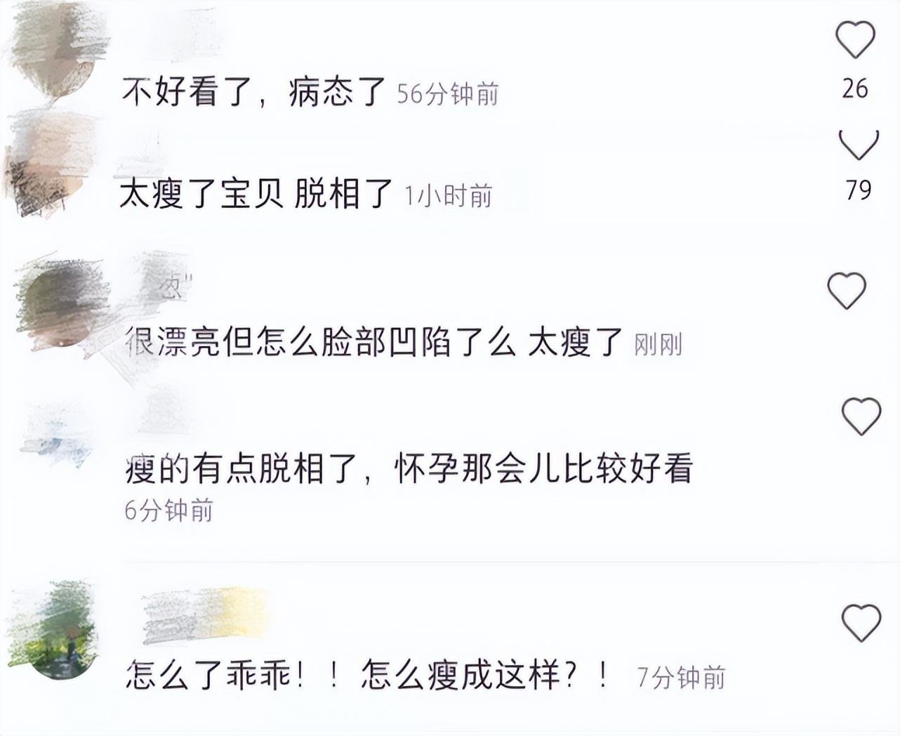 这不,在看到王灿的vlog后,网友纷纷留言称她太瘦了,瘦得不好看了,甚至还有人用“病态”来形容王灿:“不好看了,病态了”“很漂亮,但怎么脸部凹陷了么,太瘦了”“瘦得有点脱相了,怀孕那会儿比较好看”。