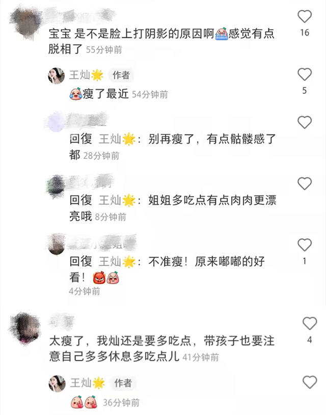 看到王灿的回复后,大家伙儿都喊话她别再瘦了,并让她多吃点,多休息。看得出来,粉丝们都非常心疼王灿。