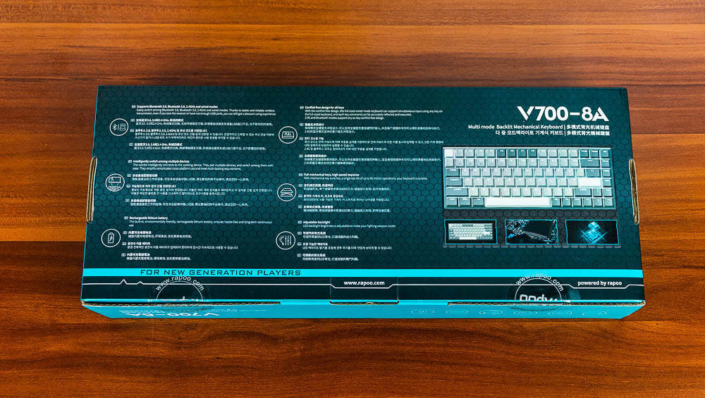 雷柏V700-8A,是一款多模式背光机械键盘,支持蓝牙3.0、蓝牙5.0、无线2.4G以及有线连接四种连接方式,智能连接多个设备,并且随心切换。内置可充电时锂电池,避免更换电池的烦恼,无线/蓝牙连接,避免冗余线材干扰。整个机械键盘采用全机械轴设计,寿命可达6000万次,经久耐用,响应灵敏。在有线模式下,支持全键盘无冲,蓝牙及2.4G支持任意六键无冲,避免游戏竞技中的干扰。考虑到电竞游戏玩家的偏好,这款键盘采用纯白色背光,并且具有7种模式,亮度和频率可调。同时这款键盘具有孤勇者、机甲紫和无人区三种配色,并且有黑、红、青、茶四种键盘轴,组合起来共12种颜色和键轴的搭配,满足不同的用户需求。我体验的这款是其中的黑轴无人区配色的雷柏V700-8A机械键盘。