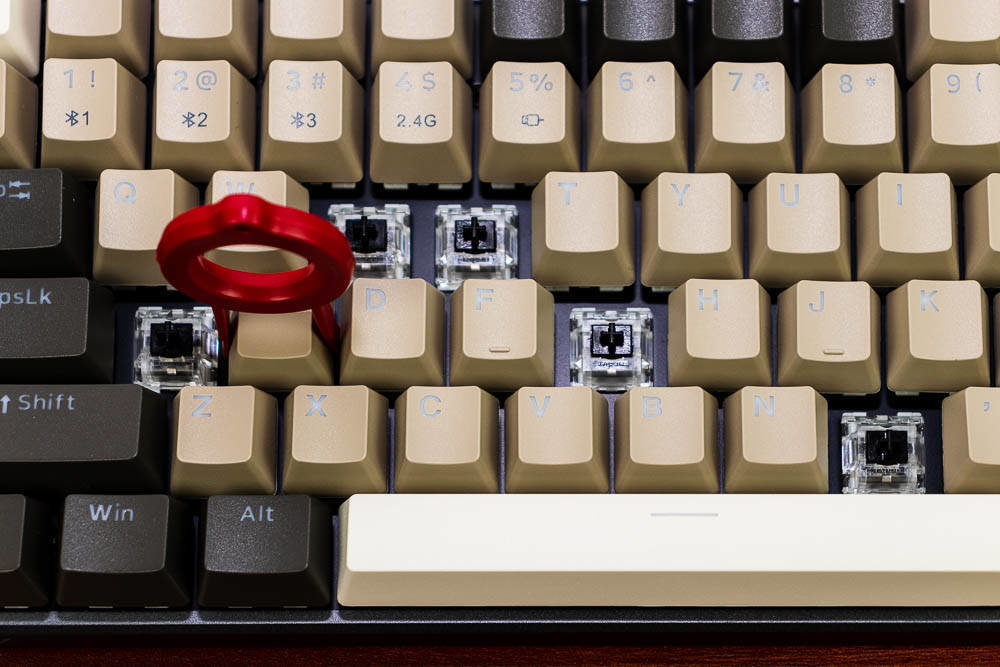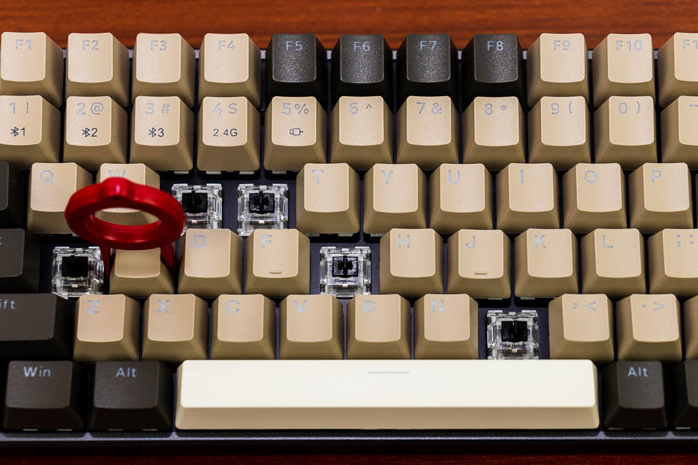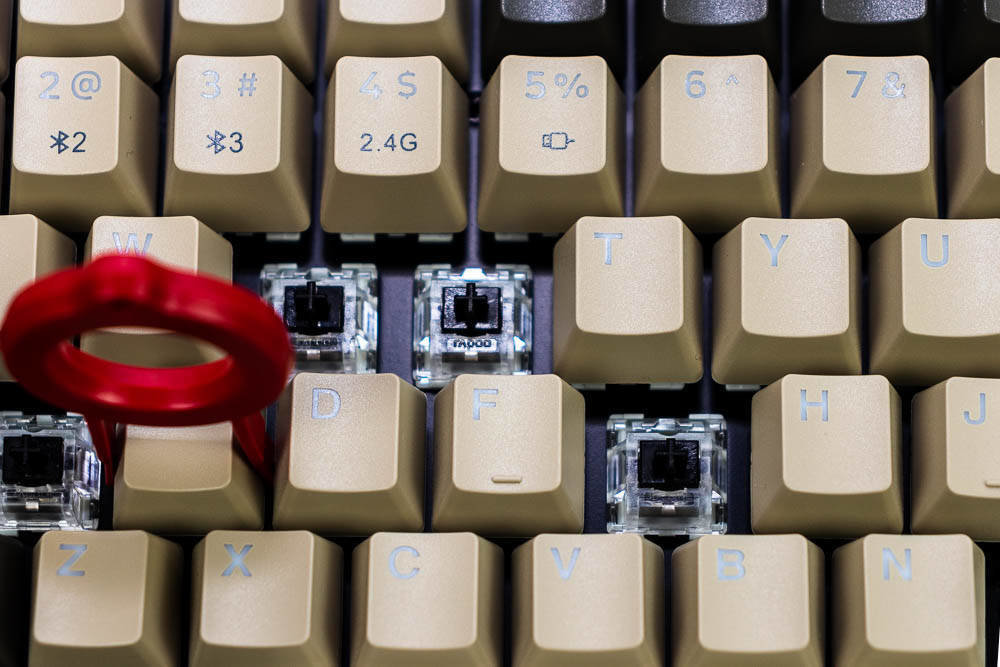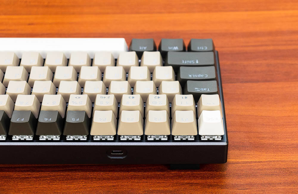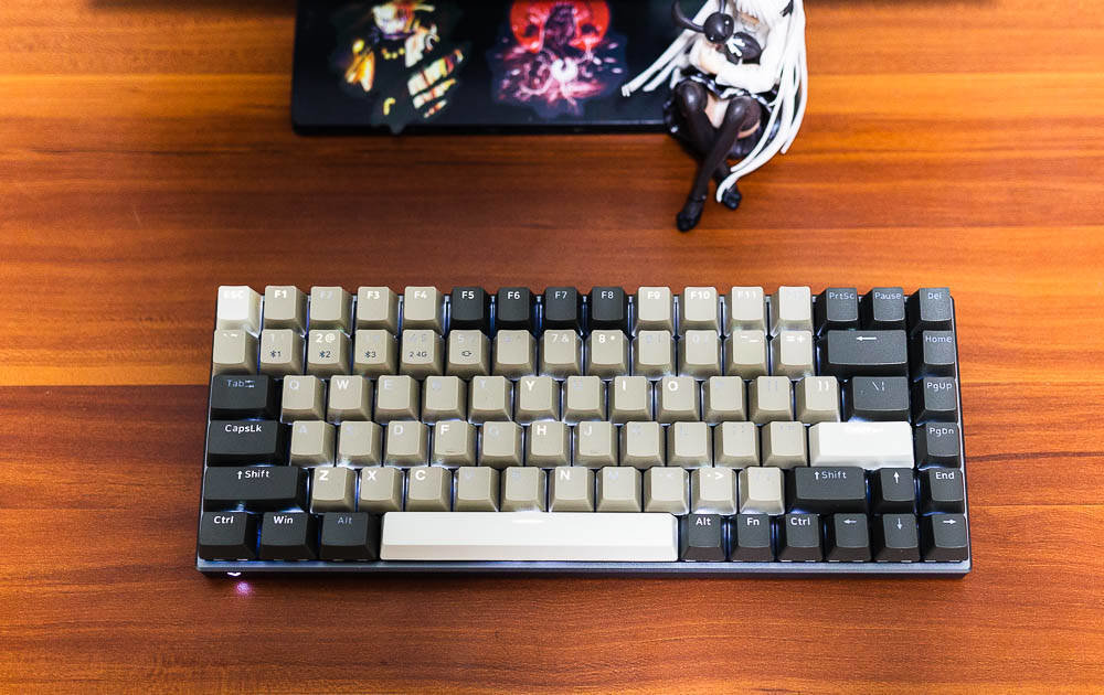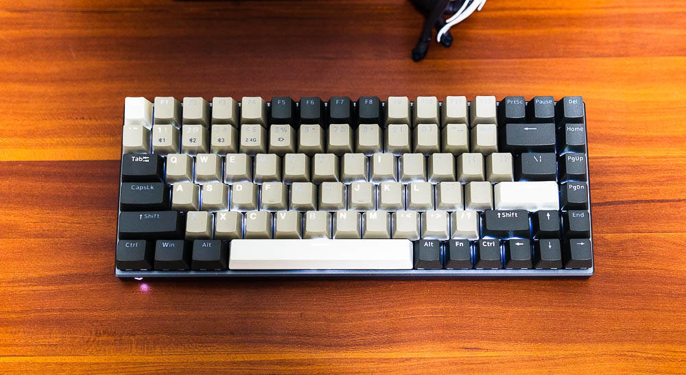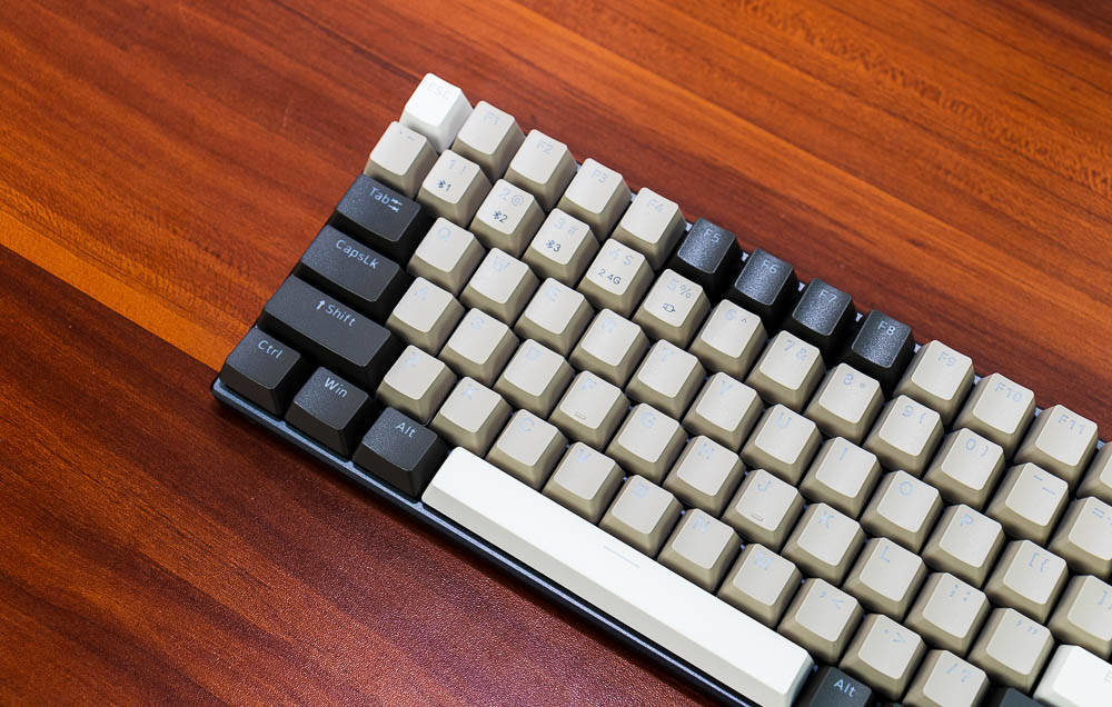 雷柏V700-8A机械键盘无人区版的颜色搭配,非常有自己的特色,根据我自己的理解,无人区给人的应该是一种荒凉寂静的感觉,散去了繁华和喧闹,更多的是一种萧条和压抑,这种环境大多出现在游戏中,特别是一些军事题材的游戏,这些无人区往往不像表面那样平静,而是暗藏着杀鸡。因此色彩搭配采用浅棕色,棕灰色,哑光白等色彩,单独拍这个键盘不会太出众,但是如果还打开纯白色背光,那就又是一番风味了。因为颜色比较接近,并且透光的字母在关闭灯效的情况下,并不太显著。