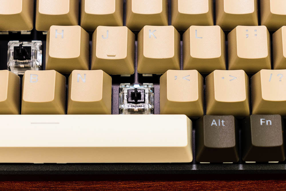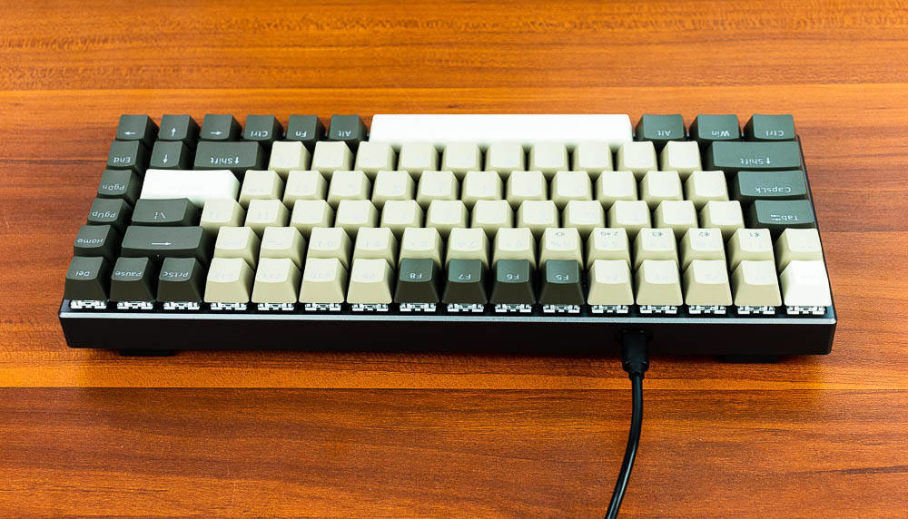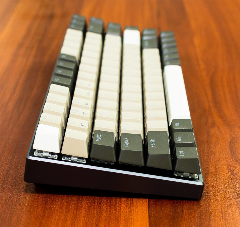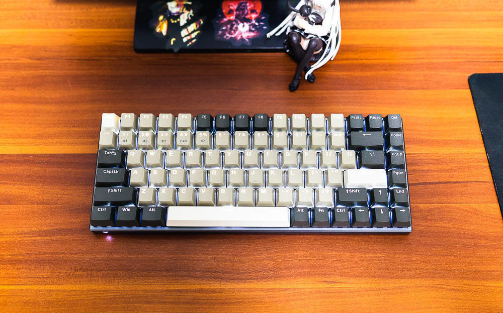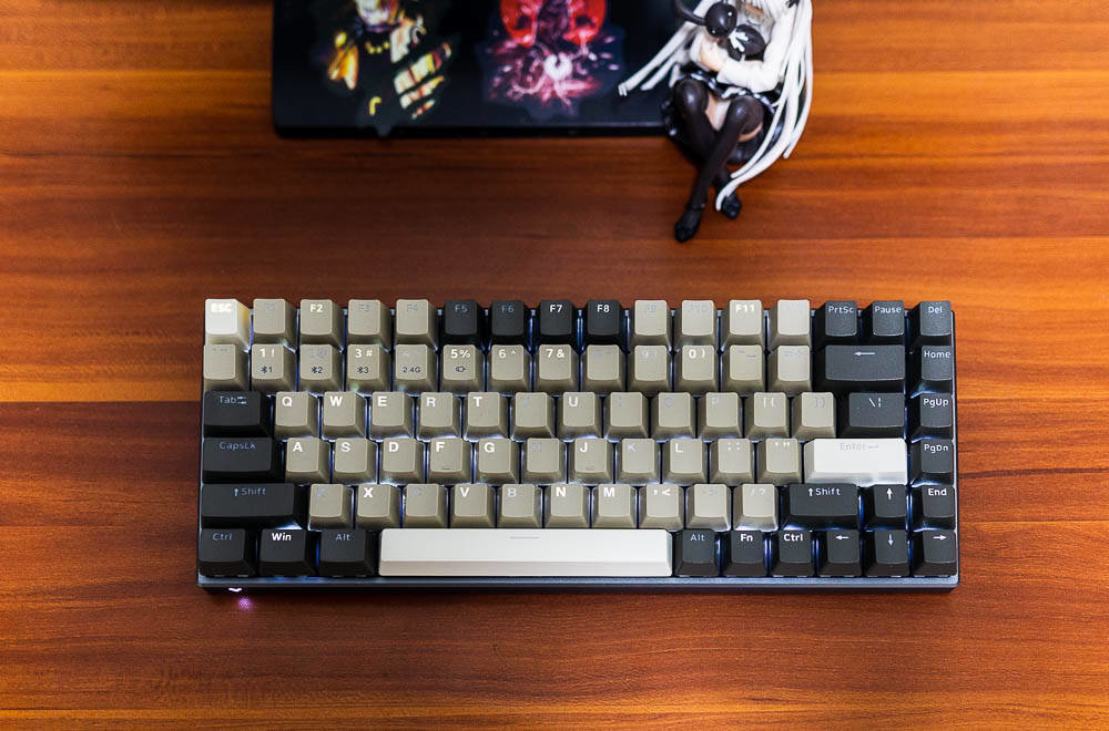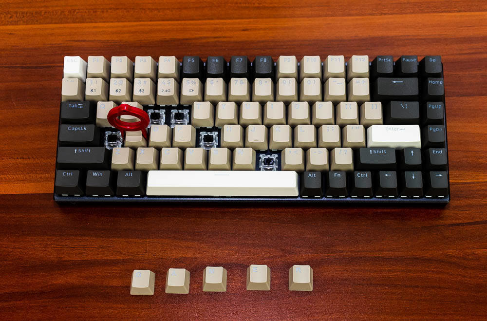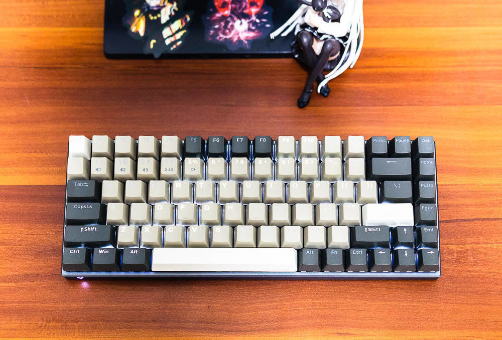 雷柏V700-8A机械键盘无人区版的颜色搭配,非常有自己的特色,根据我自己的理解,无人区给人的应该是一种荒凉寂静的感觉,散去了繁华和喧闹,更多的是一种萧条和压抑,这种环境大多出现在游戏中,特别是一些军事题材的游戏,这些无人区往往不像表面那样平静,而是暗藏着杀鸡。因此色彩搭配采用浅棕色,棕灰色,哑光白等色彩,单独拍这个键盘不会太出众,但是如果还打开纯白色背光,那就又是一番风味了。因为颜色比较接近,并且透光的字母在关闭灯效的情况下,并不太显著。