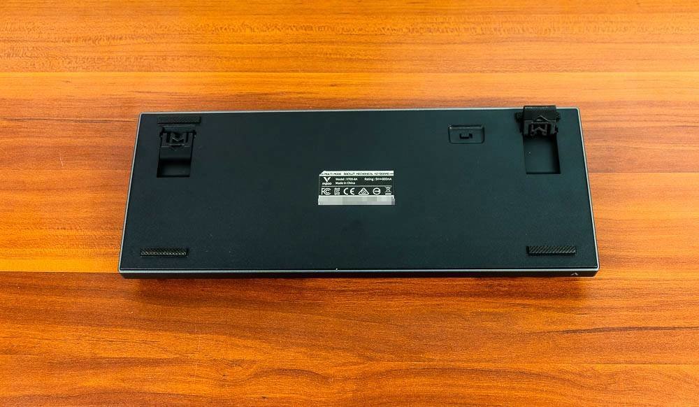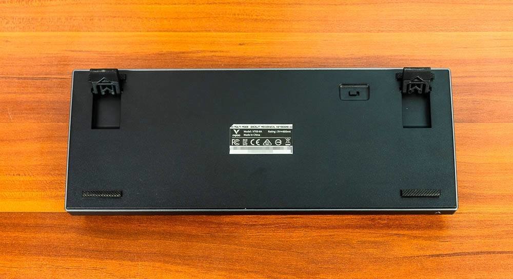 雷柏V700-8A机械键盘的底面正中,贴有一个产品标签,上有产品型号,充电电压及电流等信息。键盘四角有四个防滑脚垫,并且键盘设计有支架,可以支撑起一定的斜度,让打字或者游戏更舒适。在键盘底部,还看到一个标有ON和OFF标记的键盘电源开关。
