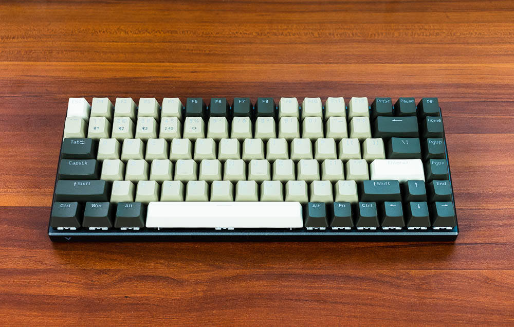 打开了灯效以后,完全不一样的感觉。但无论如何,这款键盘都是采用84键紧凑型键盘布局,键线分离设计,大大减少了桌面空间占用,携带方便,给人一种简约有序的感觉。超窄的铝合金边框,采用喷砂氧化工艺CNC切边,键身前有品牌V系列Logo,还是挺简约醒目的。键盘整体线条感明晰,简约大方,充满科技质感,并且坚固耐用,让人爱不释手。