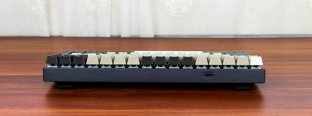 雷柏V700-8A机械键盘的左前方,有一个USB Type C接口,既可以给键盘充电,又可以充当有线连接时的接口。这款机械键盘,内置4000mAh锂电池,支持边充边用,配合雷柏低功耗无线技术,满电无线可以持续使用25-225小时(续航可达1周至2个月)。键盘配有1根约1.5米长的USB Type C接口数据线,可以用来充电,也可以用来作为有线连接的方式。不过一般会采用无线2.4G或者蓝牙连接,没电的时候,会采用有线连接以备不时之需。