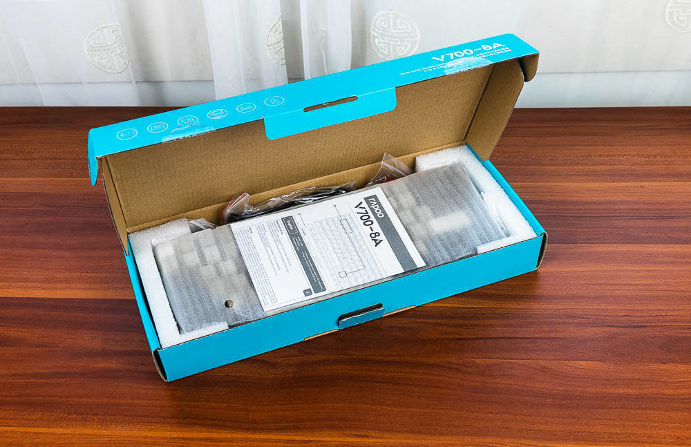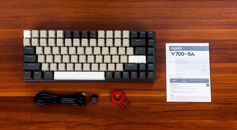 拆开纸盒,键盘的内部包装还是挺精细的,内置的泡沫可以确保键盘在运输过程中不会受到太大的冲击。整理以后,发现雷柏V700-8A多模背光游戏机械键盘的组件还是蛮丰富的,主要组件有雷柏V700-8A多模背光游戏机械键盘1个,拔键器1个,Type C接口的USB数据(充电)线1根,无线2.4G接收器1个,及快速使用指南1本。