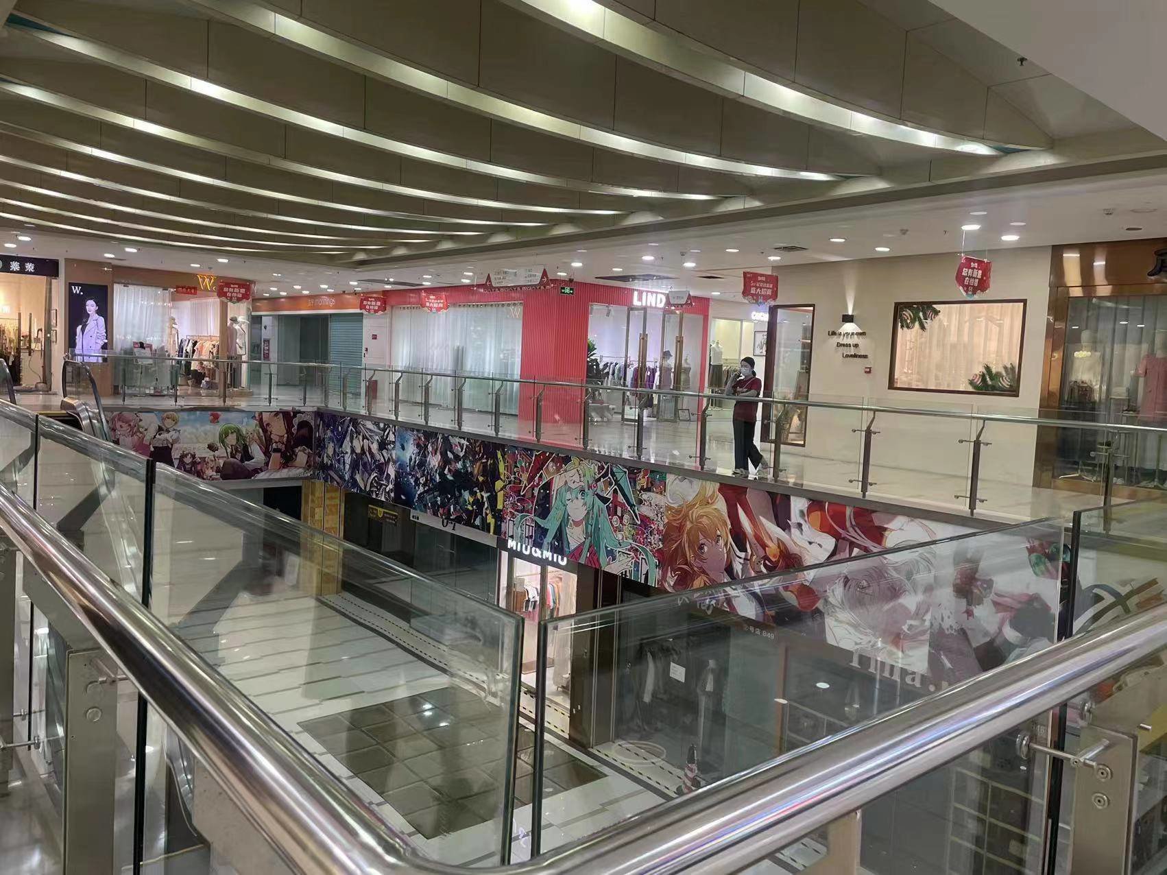 现在走进商场,一楼点缀着一排排耀眼的灯光,一间间服装店,只有少部分在营业。从橱窗看,款式挺不错的,都是年轻女性的服饰。一楼的万宁早已关门了,醒目的招牌仿佛告诉人们它曾经在这里经营过。二楼整层处于装修状态,三楼大部分关闭了,四、五楼诺大的商场只剩下零星的几个店铺,顾客屈指可数,令人不胜唏嘘。