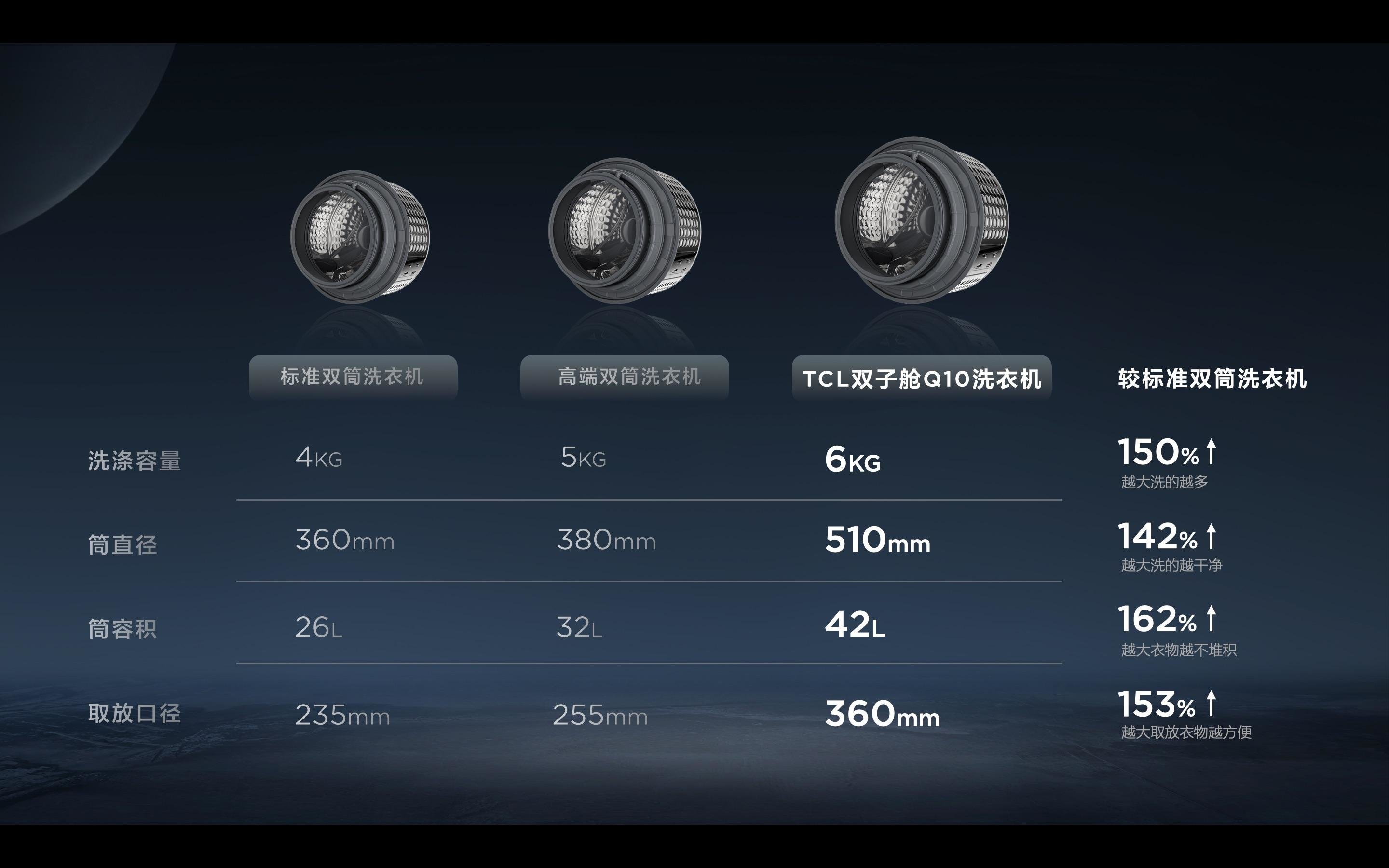 以同类产品卡萨帝C8为例,容量上是上筒4Kg+下筒8Kg,而TCL双子舱Q10上筒规格容量则达到了6Kg,是行业最大的洗涤容量,上筒的筒径高达510mm,不仅取放衣物都很方便,而且同样也是目前行业最大容量。6Kg大上筒+10Kg下筒,洗涤容量更大,洗护效率自然也就更高。无论是日常洗衣需求,还是换季时大批量的衣物洗涤,TCL双子舱Q10都能很好地满足家庭所需。